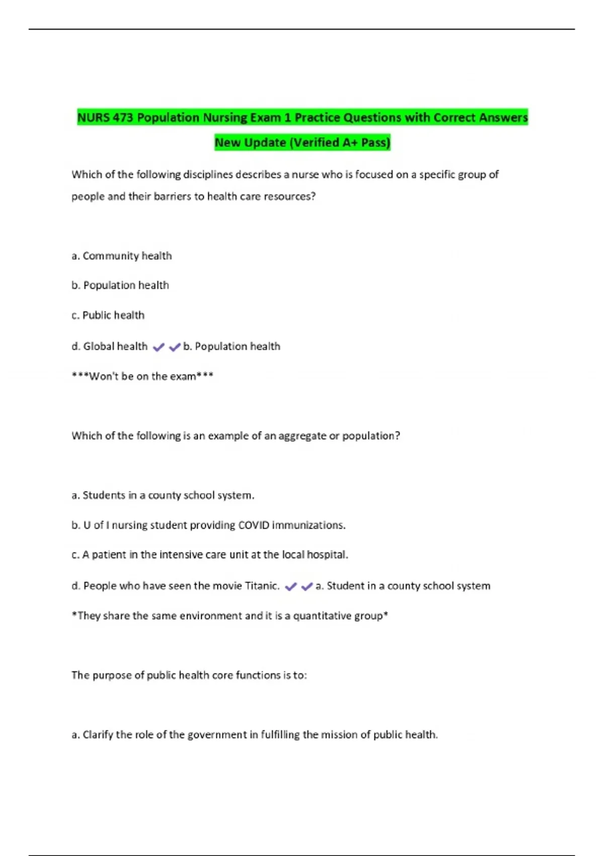 NURS 473 Population Nursing Exam 1 Practice Questions with Correct Answers New Update (Verified A+ Pass)