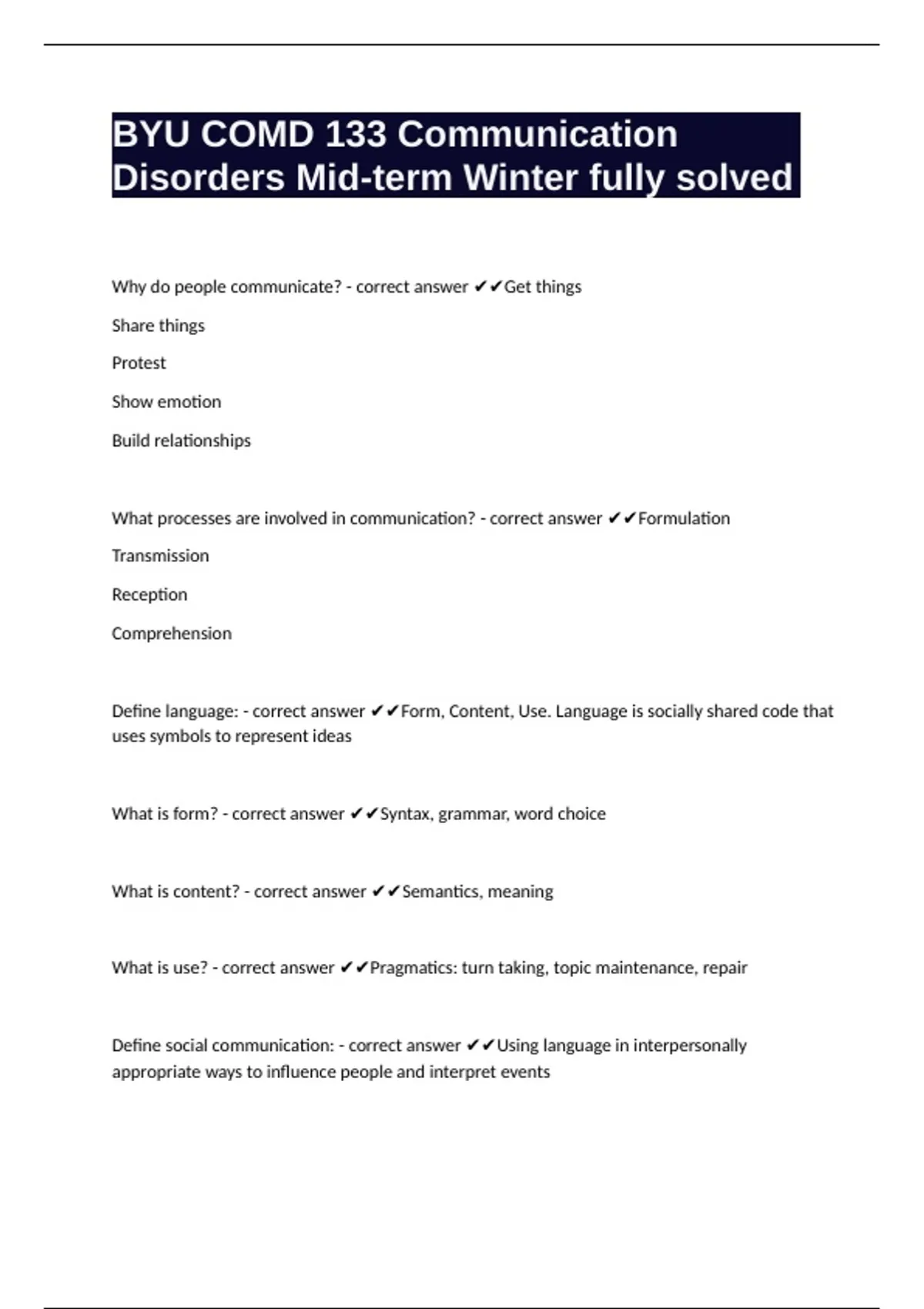 Define language: - correct answer ✔✔Form, Content, Use. Language is socially shared code that