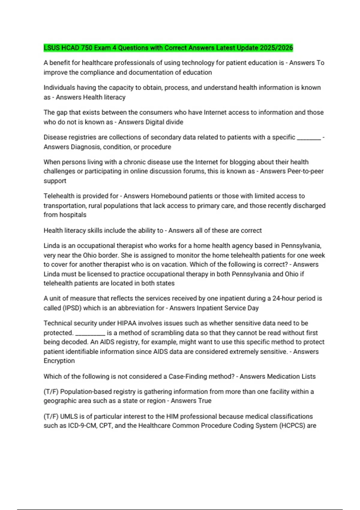 LSUS HCAD 750 Exam 4 Questions with Correct Answers Latest Update 2025/2026 A benefit for healthcare professionals of using technology for patient education is - Answers To improve the compliance and documentation of education Individuals having the capacity to obtain, process, and understand health information is known as - Answers Health literacy The gap that exists between the consumers who have Internet access to information and those who do not is known as - Answers Digital divide Disease registries are collections of secondary data related to patients with a specific ________ - Answers Diagnosis, condition, or procedure When persons living with a chronic disease use the Internet for blogging about their health challenges or participating in online discussion forums, this is known as - Answers Peer-to-peer support Telehealth is provided for - Answers Homebound patients or those with limited access to transportation, rural populations that lack access to primary care, and those recently discharged from hospitals Health literacy skills include the ability to - Answers all of these are correct Linda is an occupational therapist who works for a home health agency based in Pennsylvania, very near the Ohio border. She is assigned to monitor the home telehealth patients for one week to cover for another therapist who is on vacation. Which of the following is correct? - Answers Linda must be licensed to practice occupational therapy in both Pennsylvania and Ohio if telehealth patients are located in both states A unit of measure that reflects the services received by one inpatient during a 24-hour period is called (IPSD) which is an abbreviation for - Answers Inpatient Service Day Technical security under HIPAA involves issues such as whether sensitive data need to be protected. __________ is a method of scrambling data so that they cannot be read without first being decoded. An AIDS registry, for example, might want to use this specific method to protect patient identifiable information since AIDS data are considered extremely sensitive. - Answers Encryption Which of the following is not considered a Case-Finding method? - Answers Medication Lists (T/F) Population-based registry is gathering information from more than one facility within a geographic area such as a state or region - Answers True (T/F) UMLS is of particular interest to the HIM professional because medical classifications such as ICD-9-CM, CPT, and the Healthcare Common Procedure Coding System (HCPCS) are among the items included. - Answers True