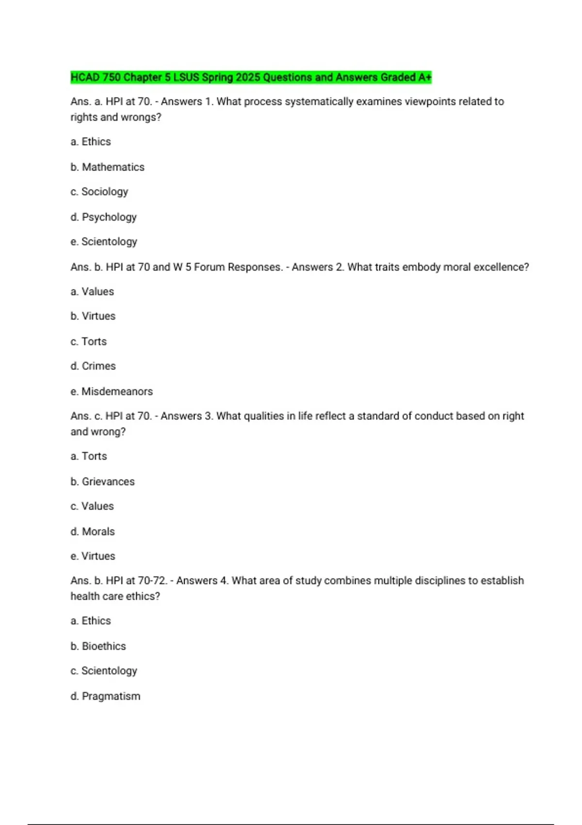 HCAD 750 Chapter 5 LSUS Spring 2025 Questions and Answers Graded A+ Ans. a. HPI at 70. - Answers 1. What process systematically examines viewpoints related to rights and wrongs? a. Ethics b. Mathematics c. Sociology d. Psychology e. Scientology Ans. b. HPI at 70 and W 5 Forum Responses. - Answers 2. What traits embody moral excellence? a. Values b. Virtues c. Torts d. Crimes e. Misdemeanors Ans. c. HPI at 70. - Answers 3. What qualities in life reflect a standard of conduct based on right and wrong? a. Torts b. Grievances c. Values d. Morals e. Virtues Ans. b. HPI at 70-72. - Answers 4. What area of study combines multiple disciplines to establish health care ethics? a. Ethics b. Bioethics c. Scientology d. Pragmatism e. Sociology Ans. d. HPI at 71. - Answers 5. What device in health care may raise the greatest legal and ethical challenges? a. Coulter Counters b. Imaging Systems c. BP Cuffs d. Smartphones e. Ophthalmoscopes Ans. c. HPI at 71. - Answers 6. What arises from a problematic moral question in health care? a. Decision-Making b. Inquiry Dilemma c. Ethical Dilemma d. Moral Dilemma e. All of the above are correct choices. Ans. a. HPI at 73. - Answers 7. What is the foundation for ethical decision-making in health care? a. Principlism b. Pragmatism c. Socialism d. Communism e. Dynamism Ans. b. HPI at 73-74. - Answers 8. What ethical principle embodies the concept of avoiding harm? a. Autonomy b. Nonmaleficence c. Beneficence d. Social Justice e. Dilemma Ans. c. HPI at 73-74. - Answers 9. What ethical principle reflects free-choice in health care decisions? a. Nonmaleficence b. Beneficence c. Autonomy d. Social Justice e. Dilemma