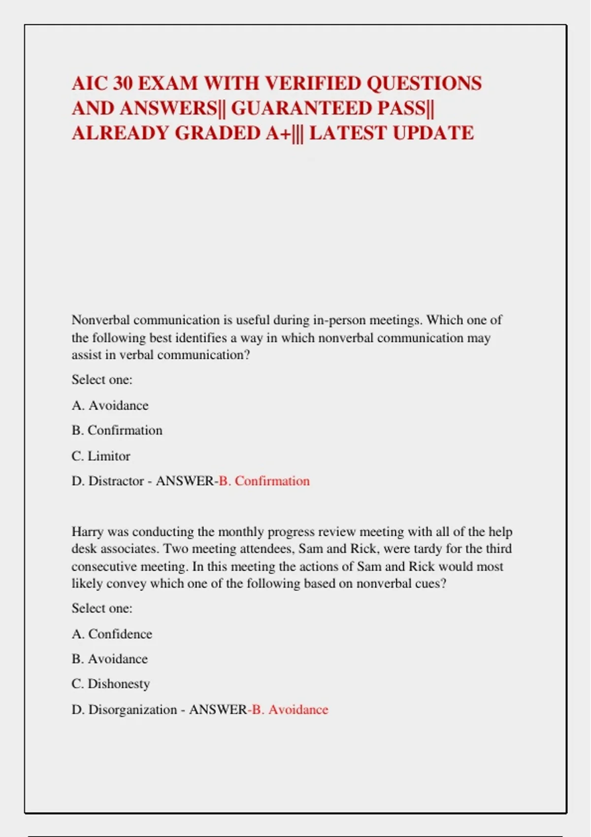 AIC 30 EXAM WITH VERIFIED QUESTIONS AND ANSWERS|| GUARANTEED PASS|| ALREADY GRADED A+||| LATEST UPDATE Nonverbal communication is useful during in-person meetings. Which one of the following best identifies a way in which nonverbal communication may assist in verbal communication? Select one: A. Avoidance B. Confirmation C. Limitor D. Distractor - ANSWER-B. Confirmation Harry was conducting the monthly progress review meeting with all of the help desk associates. Two meeting attendees, Sam and Rick, were tardy for the third consecutive meeting. In this meeting the actions of Sam and Rick would most likely convey which one of the following based on nonverbal cues? Select one: A. Confidence B. Avoidance C. Dishonesty D. Disorganization - ANSWER-B. Avoidance Sam was conducting the monthly progress review meeting with all of the help desk associates. Sam had requested that April supply a report on the maintenance efforts for the telephone system so that all associates would be aware of the functionality changes. After Sam introduced April, she began shuffling her documents and discussed the system changes in random order. In this meeting April's actions would most likely convey which one of the following based on nonverbal cues? Select one: A. Enthusiasm B. Dishonesty C. Disorganization D. Unimportance - ANSWER-C. Disorganization Dennis reported for work wearing a suit and tie for the client review meeting that he would be conducting. When Dennis entered the meeting room he found that he was the first to arrive. Which one of the following nonverbal expression best identifies Dennis' actions? Select one: A. Professionalism B. Friendliness C. Enthusiasm D. Nervousness - ANSWER-A. Professionalism When a claimant conveys a nonverbal cue that contradicts a verbal communication it would most likely mean that a claim representative should do which one of the following? Select one: A. Add lines of questioning B. Limit the questions C. Ignore the second cue D. Ask the claimant to repeat the statement - ANSWER-A. Add lines of questioning A nonverbal expression that conveys a lack of sincerity is best identified to which one of the following actions? Select one: A. Shifting eye movement B. Frowning C. Overall eye expression D. Failing to make eye contact - ANSWER-A. Shifting eye movement