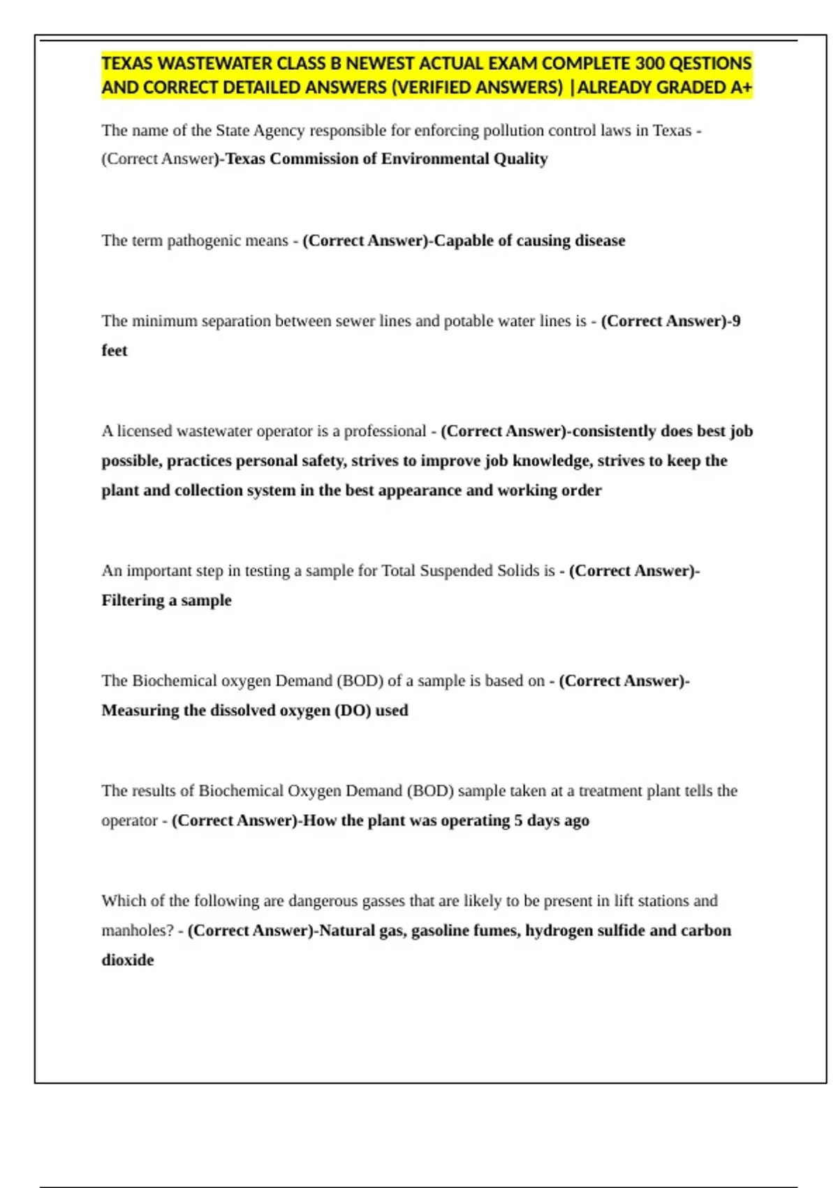 TEXAS WASTEWATER CLASS B NEWEST ACTUAL EXAM COMPLETE 300 QESTIONS