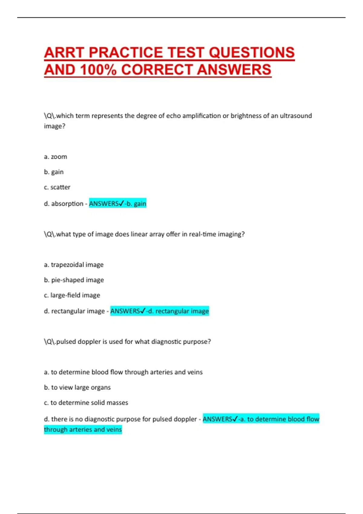 ARRT PRACTICE TEST QUESTIONS AND 100% CORRECT ANSWERS Q.which term represents the degree of echo amplification or brightness of an ultrasound image? a. zoom b. gain c. scatter d. absorption - ANSWERS-b. gain Q.what type of image does linear array offer in real-time imaging? a. trapezoidal image b. pie-shaped image c. large-field image d. rectangular image - ANSWERS-d. rectangular image Q.pulsed doppler is used for what diagnostic purpose? a. to determine blood flow through arteries and veins b. to view large organs c. to determine solid masses d. there is no diagnostic purpose for pulsed doppler - ANSWERS-a. to determine blood flow through arteries and veins Q.the wave characteristic of frequency is measured by what unit of measurement? a. gain b. color c. length d. hertz - ANSWERS-d. hertz Q.the comet tail image indicated which of the following to the ultrasound technician? a. the edge of the organ b. artifact c. the sign of an abscess d. the right depth of the transducer - ANSWERS-b. artifact Q.you are performing an ultrasound exam of the abdomen and pelvis of a patient with an unexplained fever. you understand the purpose of the exam is to look for which of the following? a. abscess, inflammation, or mass b. enlarged lymph nodes c. both a and b d. neither a nor b - ANSWERS-c. both a and b Q.what is an appropriate way to store color images of an ultrasound scan?