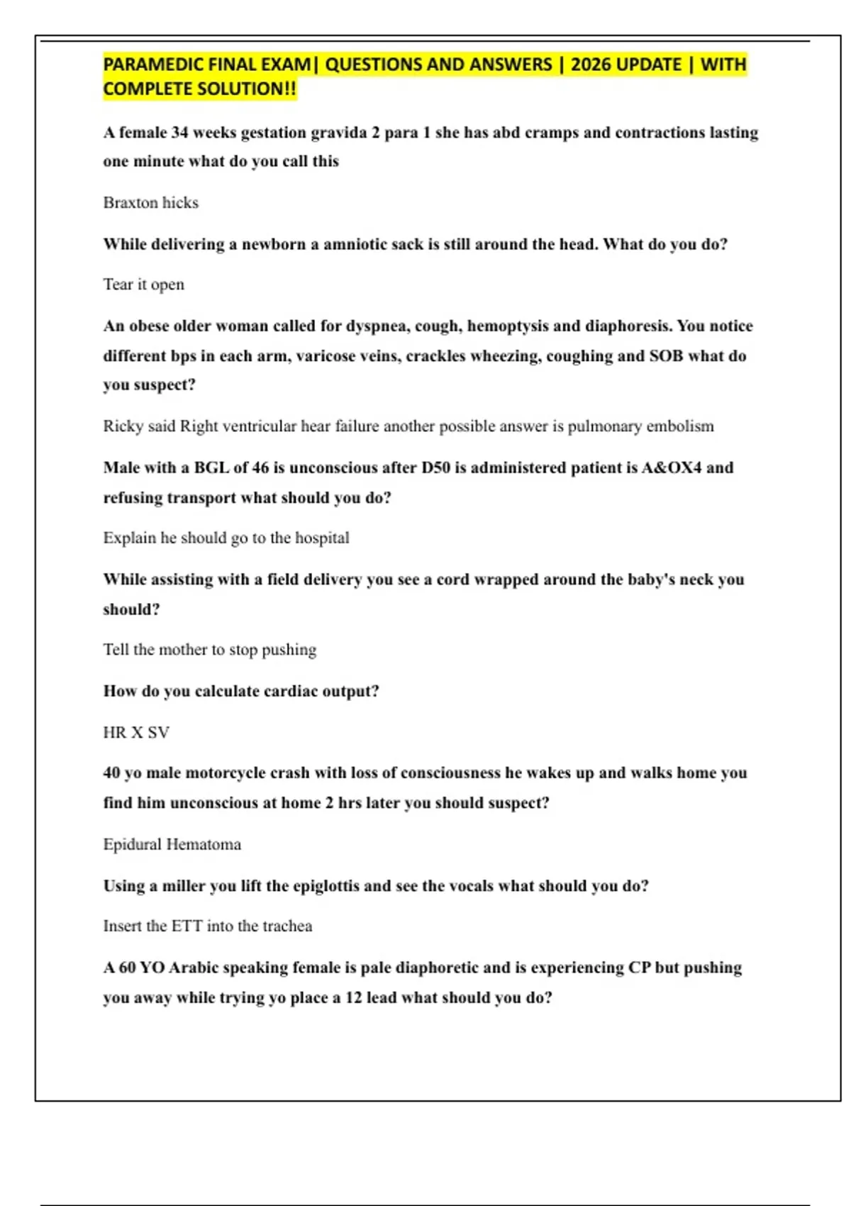 PARAMEDIC FINAL EXAM| QUESTIONS AND ANSWERS | 2026 UPDATE | WITH