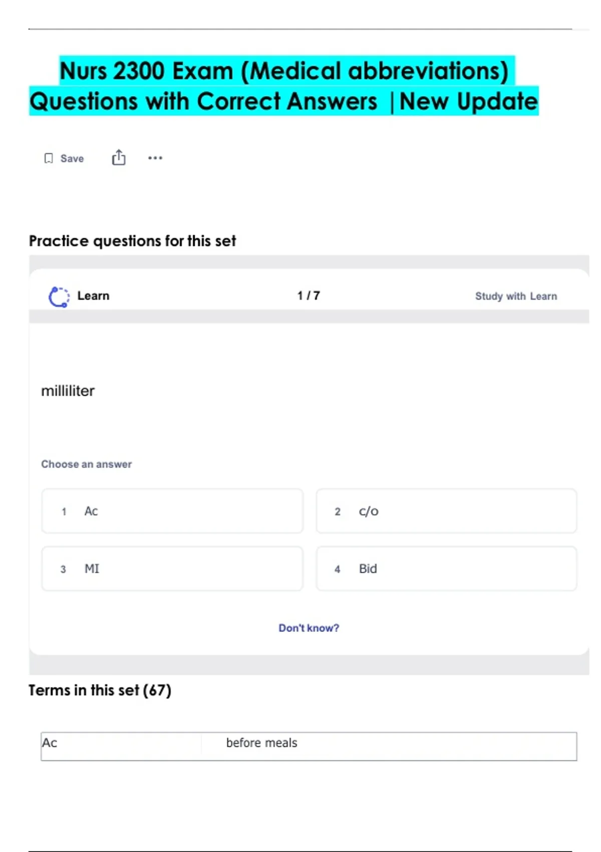 Nurs 2300 Exam (Medical abbreviations) Questions with Correct Answers |New Update