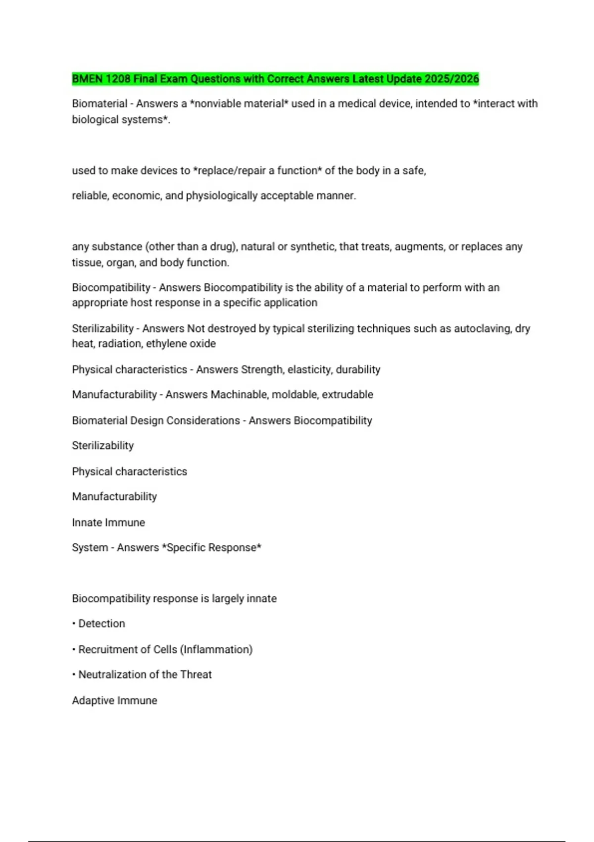 BMEN 1208 Final Exam Questions with Correct Answers Latest Update 2025/2026 Biomaterial - Answers a *nonviable material* used in a medical device, intended to *interact with biological systems*. used to make devices to *replace/repair a function* of the body in a safe, reliable, economic, and physiologically acceptable manner. any substance (other than a drug), natural or synthetic, that treats, augments, or replaces any tissue, organ, and body function. Biocompatibility - Answers Biocompatibility is the ability of a material to perform with an appropriate host response in a specific application Sterilizability - Answers Not destroyed by typical sterilizing techniques such as autoclaving, dry heat, radiation, ethylene oxide Physical characteristics - Answers Strength, elasticity, durability Manufacturability - Answers Machinable, moldable, extrudable Biomaterial Design Considerations - Answers Biocompatibility Sterilizability Physical characteristics Manufacturability Innate Immune System - Answers *Specific Response* Biocompatibility response is largely innate • Detection • Recruitment of Cells (Inflammation) • Neutralization of the Threat Adaptive Immune System - Answers *Non-Specific Response* Macrophages: Eat and secrete Macrophages - Answers *Phagocytosis* Secretes signals to attract other cells. Frustrated Phagocytosis - Answers Macrophages try to eat something as big as most implants, they *get frustrated* and eventually *wall off* the implant inside a fibrous structure Clinical Engineering - Answers A specialty within Biomedical engineering responsible primarily for applying and implementing medical technology to optimise healthcare delivery Field engineer - Answers Field means employee is spending time at the point of use. Often used for devices that require extensive *calibration/initial setup/careful sizing selection* Operations - Answers *Manufacturing* - physically producing the device *Packaging* - ensuring that device will get to point of use in appropriate state *Sterilization* - making devices safe/clean to use Development - Answers ironing out the practicalities of implementing new ways Research - Answers come up with new/better ways of doing things Signal - Answers a function that conveys information about the behavior or attributes of some phenomenon Electrcardiogram (ECG) - Answers electrical activity of the heart Cardio-heart Electromyogram (EMG) - Answers electrical activity of the muscles myo- muscle Electrooculogram (EOG) - Answers electrical activity of the eye oculo- eye Galvanic skin response (GSR) - Answers electrical conductance of the skin Sinusoids - Answers Time varying signals often exhibit periodicity theres a math thing for it Hz - Answers number of cycles per second Filtering - Answers selectively *removes frequencies* from original signal Continuous signals - Answers such as voltage are defined for all *instants of time* Discrete signals - Answers defined only at *specific