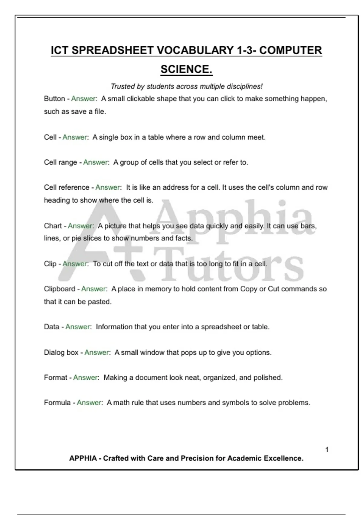 ICT SPREADSHEET VOCABULARY 1-3- COMPUTER SCIENCE. Trusted by students across multiple disciplines!