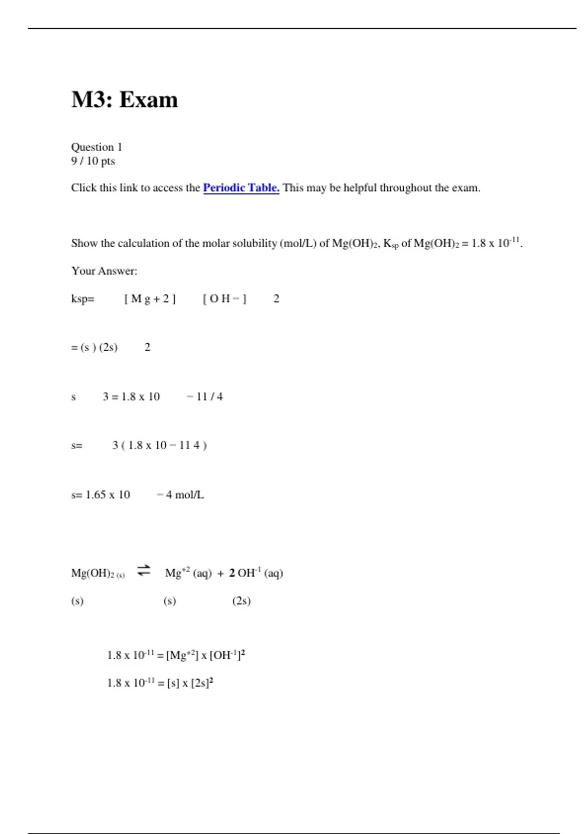 Show the calculation of the molar solubility (mol/L) of Mg(OH)2, Ksp of Mg(OH)2 = 1.8 x 10-11.