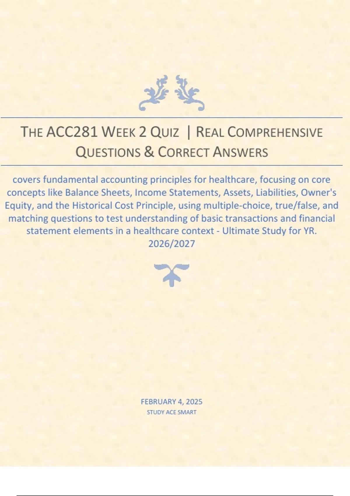 THE ACC281 WEEK 2 QUIZ | REAL COMPREHENSIVE QUESTIONS & CORRECT ANSWERS covers fundamental accounting principles for healthcare, focusing on core concepts like Balance Sheets, Income Statements, Assets, Liabilities, Owner's Equity, and the Historical Cost Principle, using multiple-choice, true/false, and matching questions to test understanding of basic transactions and financial statement elements in a healthcare context - Ultimate Study for YR. 2026/2027
