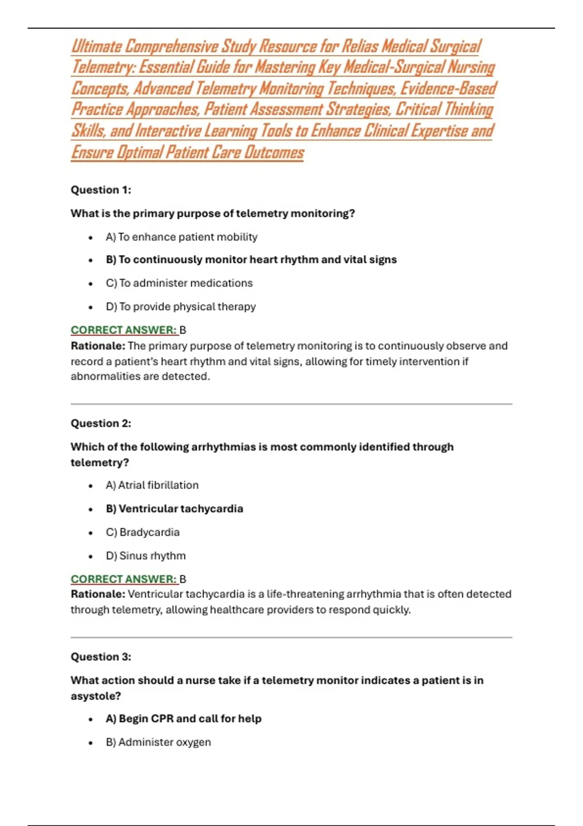 Elevate your nursing capabilities with this ultimate comprehensive study resource for Relias Medical Surgical Telemetry. This essential guide is meticulously crafted for healthcare professionals who aim to master key medical-surgical nursing concepts and advanced telemetry monitoring techniques. Emphasizing evidence-based practice approaches and effective patient assessment strategies, this resource equips you with the necessary knowledge for high-quality patient care in telemetry settings. It also enhances your critical thinking skills through engaging scenarios and interactive learning tools, preparing you for real-world clinical challenges. Whether you're preparing for certification or looking to improve patient care outcomes, this study guide is an invaluable asset for advancing your clinical expertise and nursing career.