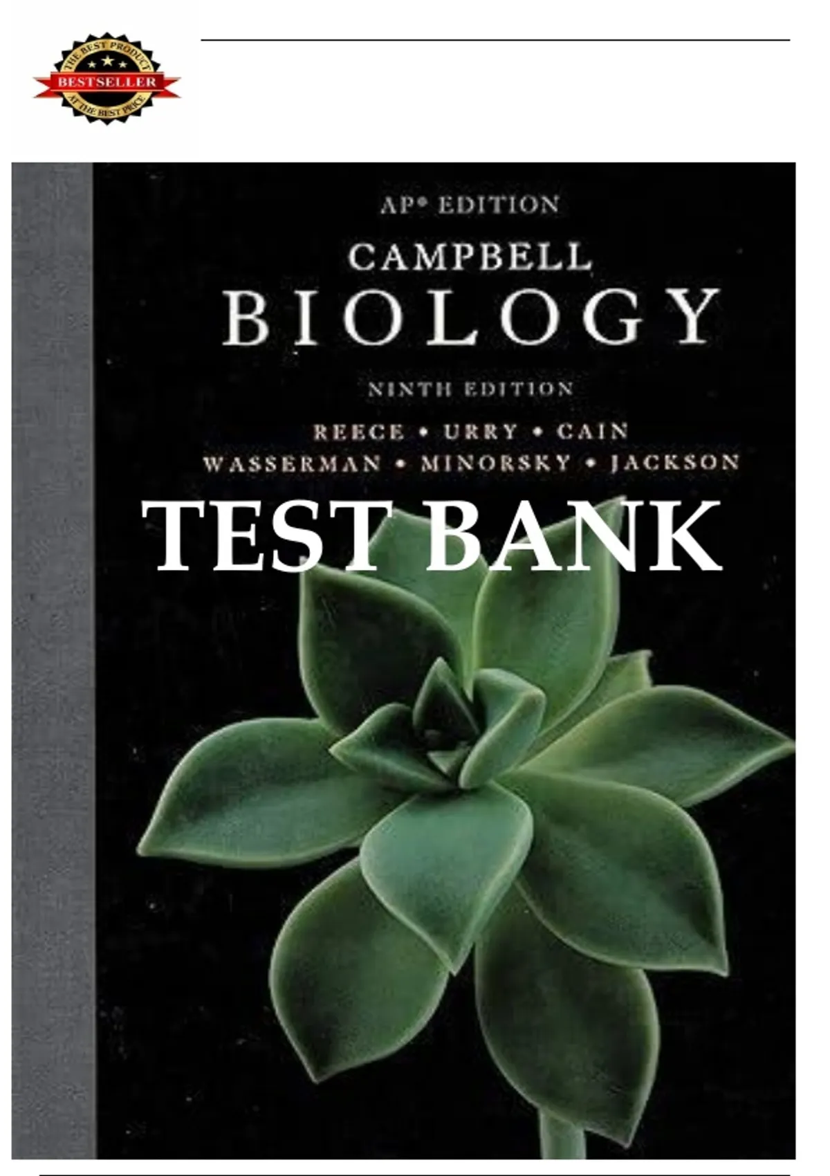 This complete Test Bank for Campbell Biology (9th Edition) provides a comprehensive collection of chapter-by-chapter exam questions covering all chapters of the textbook. It is fully aligned with the 9th Edition by Lisa A. Urry, Michael L. Cain, Steven A. Wasserman, Peter V. Minorsky, and Jane B. Reece, one of the most widely used biology textbooks in undergraduate education. The test bank includes a wide variety of exam-style questions, such as multiple-choice, conceptual reasoning, application-based problems, data-interpretation questions, and scenario-driven items. Content spans the full scope of modern biology, including chemistry of life, cell structure and function, membranes and transport, metabolism, photosynthesis, cellular respiration, cell communication, cell cycle, meiosis and mitosis, genetics, molecular biology, gene expression, biotechnology, evolution, diversity of life, plant biology, animal physiology, ecology, and conservation biology. Questions are designed to reinforce scientific thinking, experimental analysis, and biological problem-solving skills commonly tested in college-level biology exams. Fully keyed answers are included, making this resource suitable for self-assessment, exam preparation, quiz creation, homework review, and instructor use. As a complete all-chapters guide, this test bank is ideal for students in general biology, pre-med, pre-nursing, life sciences, and allied health programs, supporting mastery of both foundational concepts and advanced biological principles