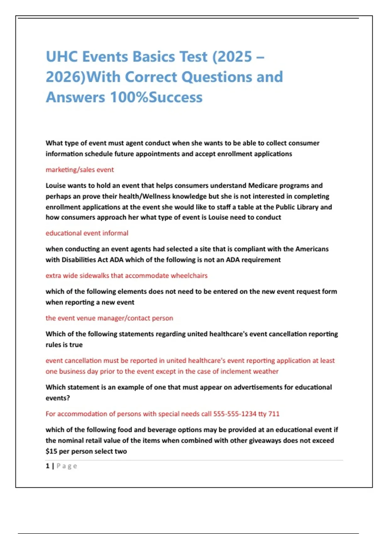 This up-to-date test bank contains verified questions and answers for the UnitedHealthcare (UHC) Events Basics Test for the 2025–2026 certification period. It covers essential compliance rules, event types, advertising requirements, giveaways, and reporting procedures for Medicare educational and marketing/sales events. Ideal for agents, representatives, and anyone preparing for UHC certification, this resource ensures understanding of CMS guidelines, ADA compliance, nominal value limits, and ethical marketing practices. Use this to confidently pass the UHC Events Basics Test and conduct compliant Medicare events.