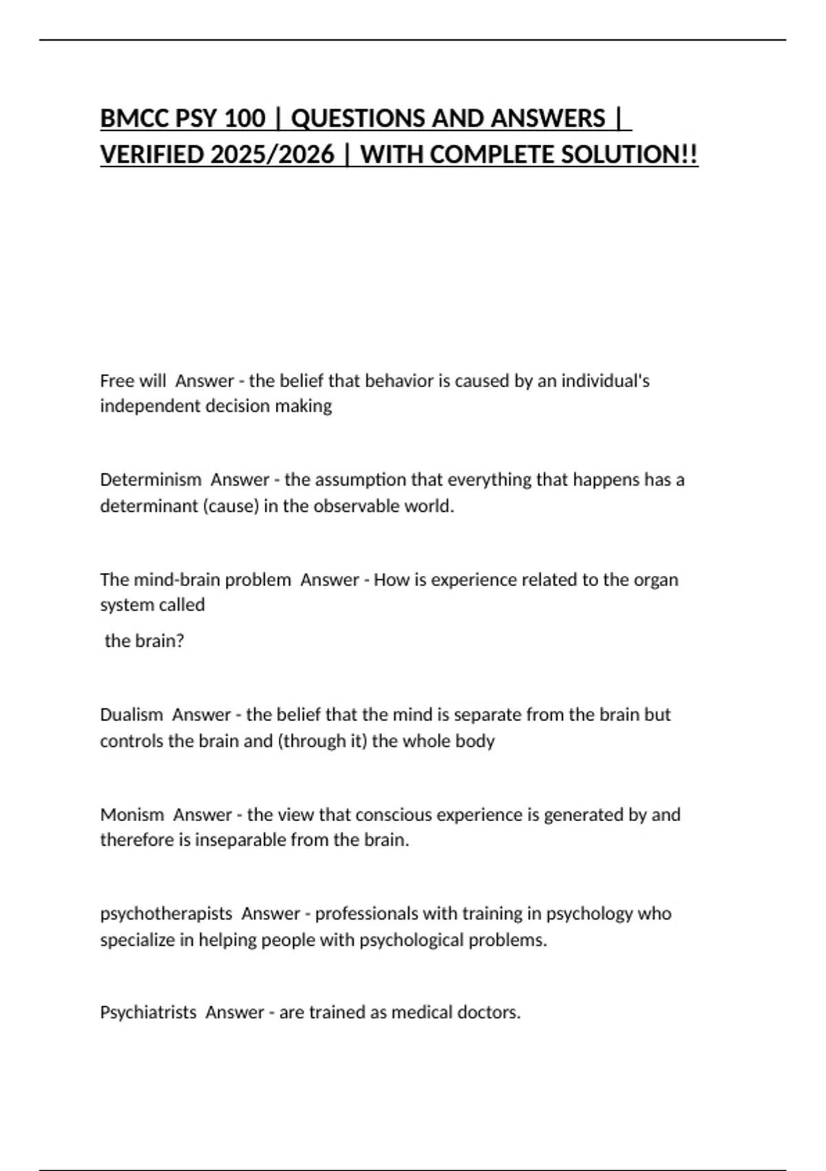 BMCC PSY 100 | QUESTIONS AND ANSWERS | VERIFIED 2025/2026 | WITH COMPLETE SOLUTION!!