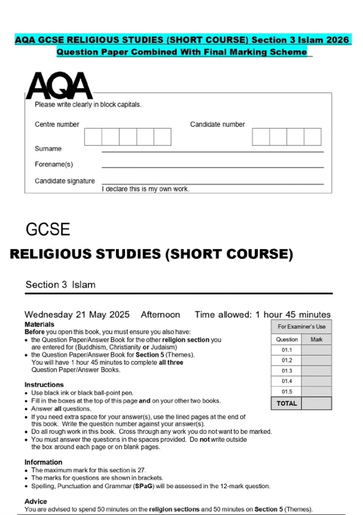 AQA GCSE RELIGIOUS STUDIES (SHORT COURSE) Section 3 Islam 2026 Question Paper Combined With Final Marking Scheme
