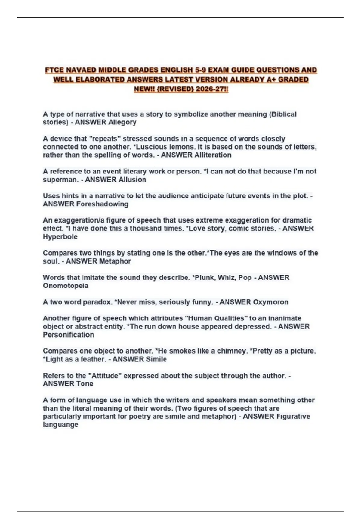 FTCE NAVAED MIDDLE GRADES ENGLISH 5-9 EXAM GUIDE QUESTIONS AND WELL ELABORATED ANSWERS LATEST VERSION ALREADY A+ GRADED NEW!! {REVISED} 2026-27!!...