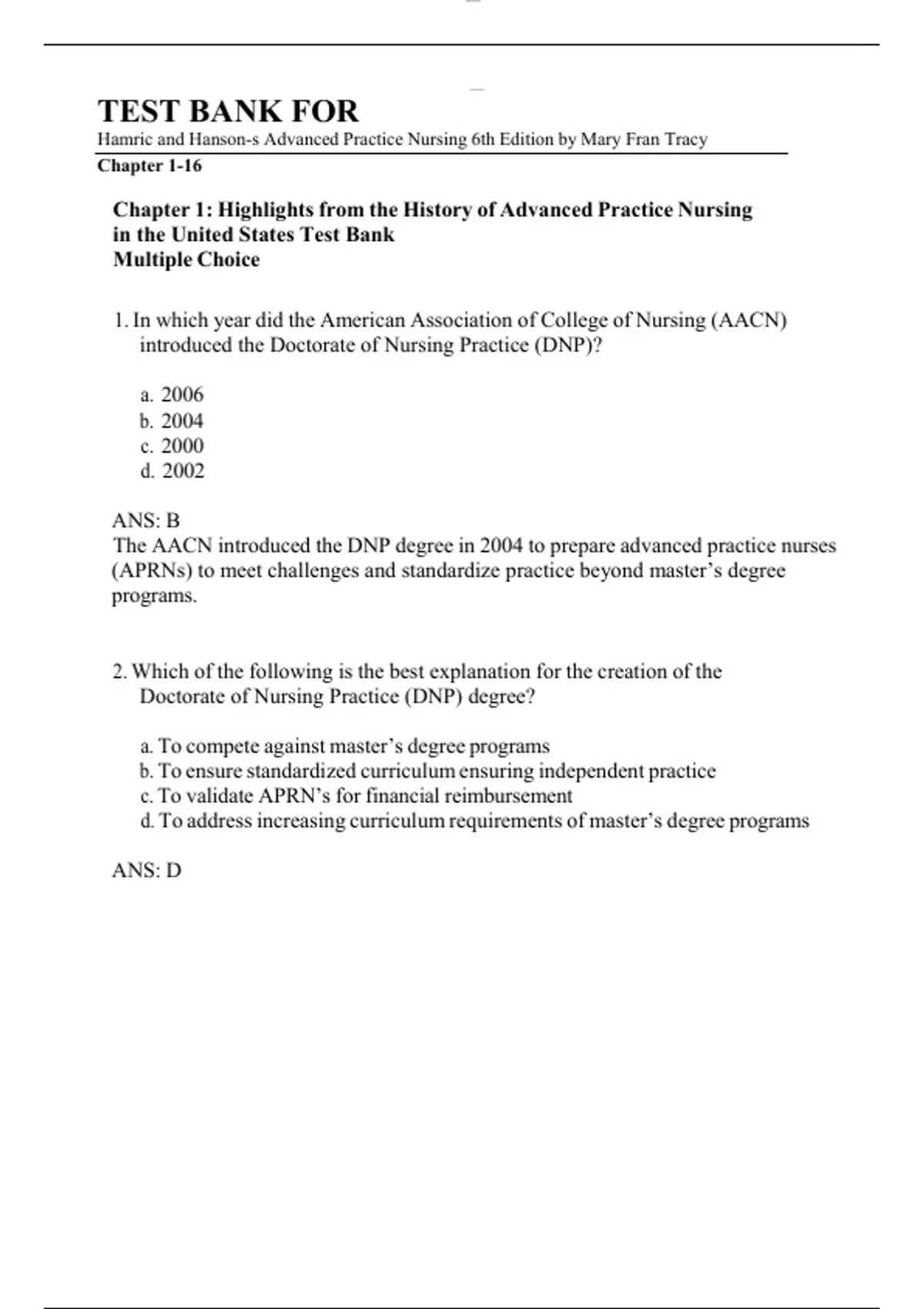 Test Bank For Hamric and Hanson's Advanced Practice Nursing 6th Edition by Mary Fran Tracy Chapter 1-16 (Complete Guide A+)