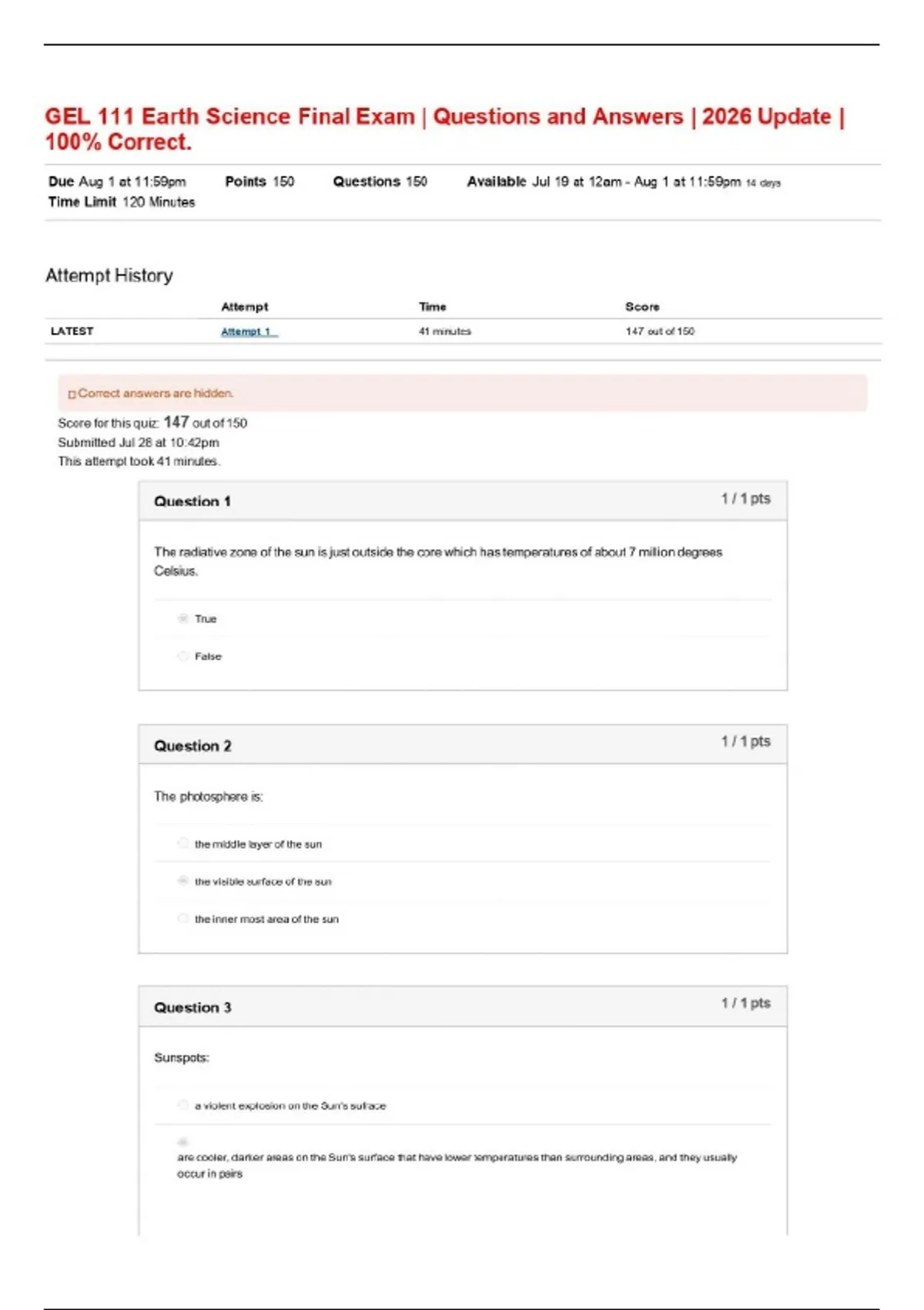 GEL 111 Earth Science Final Exam | Questions and Answers | 2026 Update | 100% Correct.