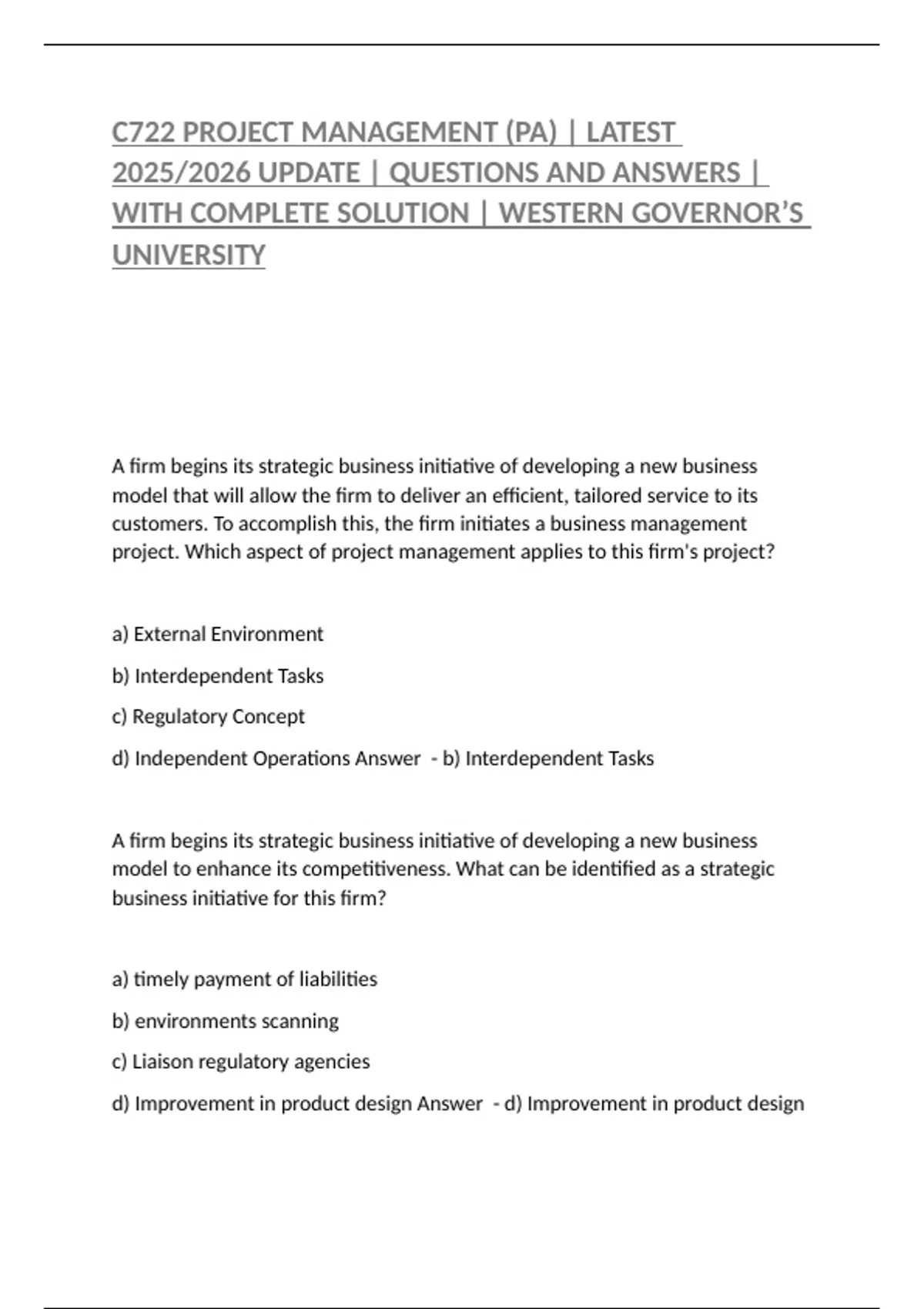 C722 PROJECT MANAGEMENT (PA) | LATEST 2025/2026 UPDATE | QUESTIONS AND ANSWERS | WITH COMPLETE SOLUTION | WESTERN GOVERNOR’S UNIVERSITY