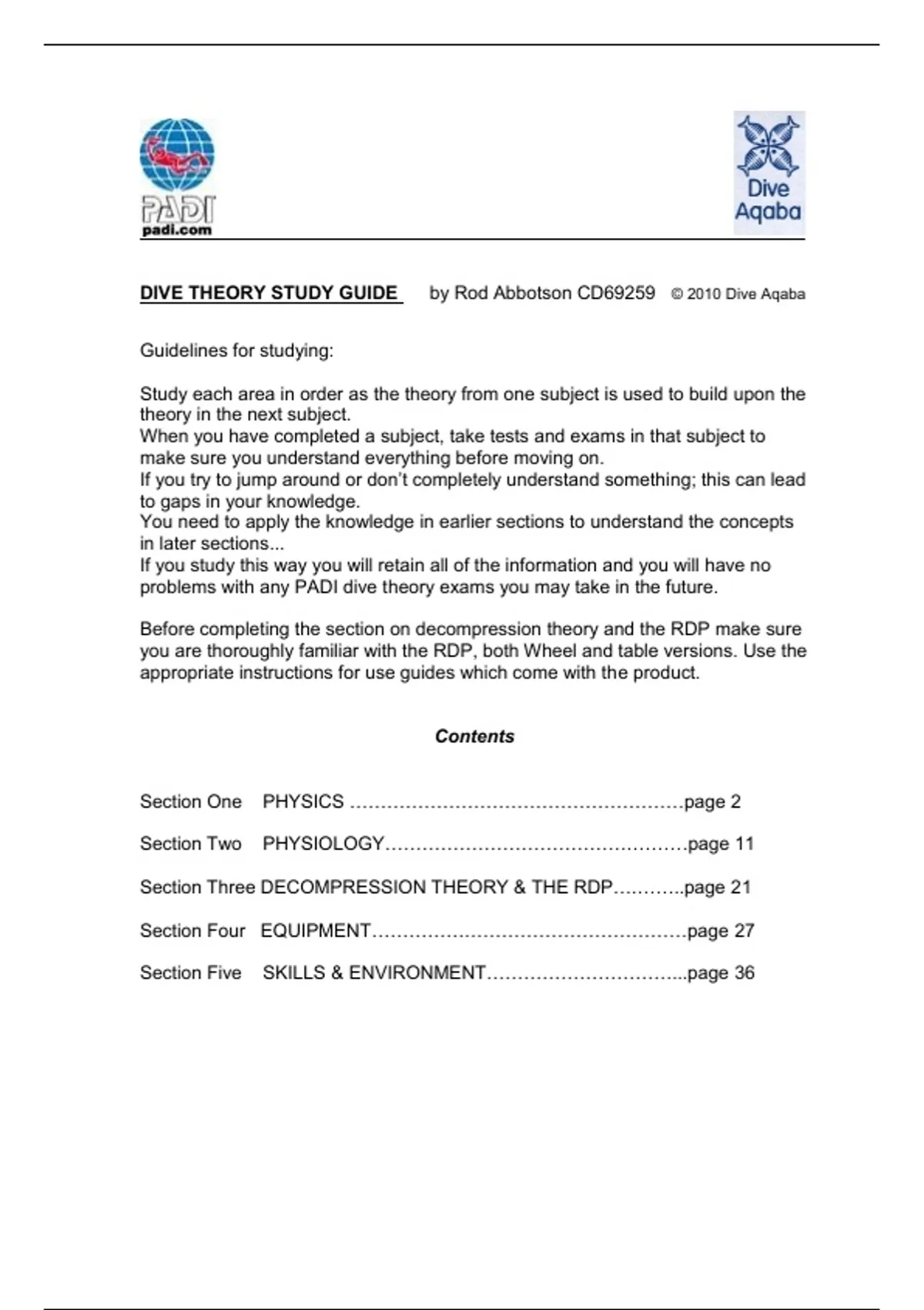 DIVE THEORY STUDY GUIDE by Rod Abbotson CD69259 © 2010 Dive Aqaba