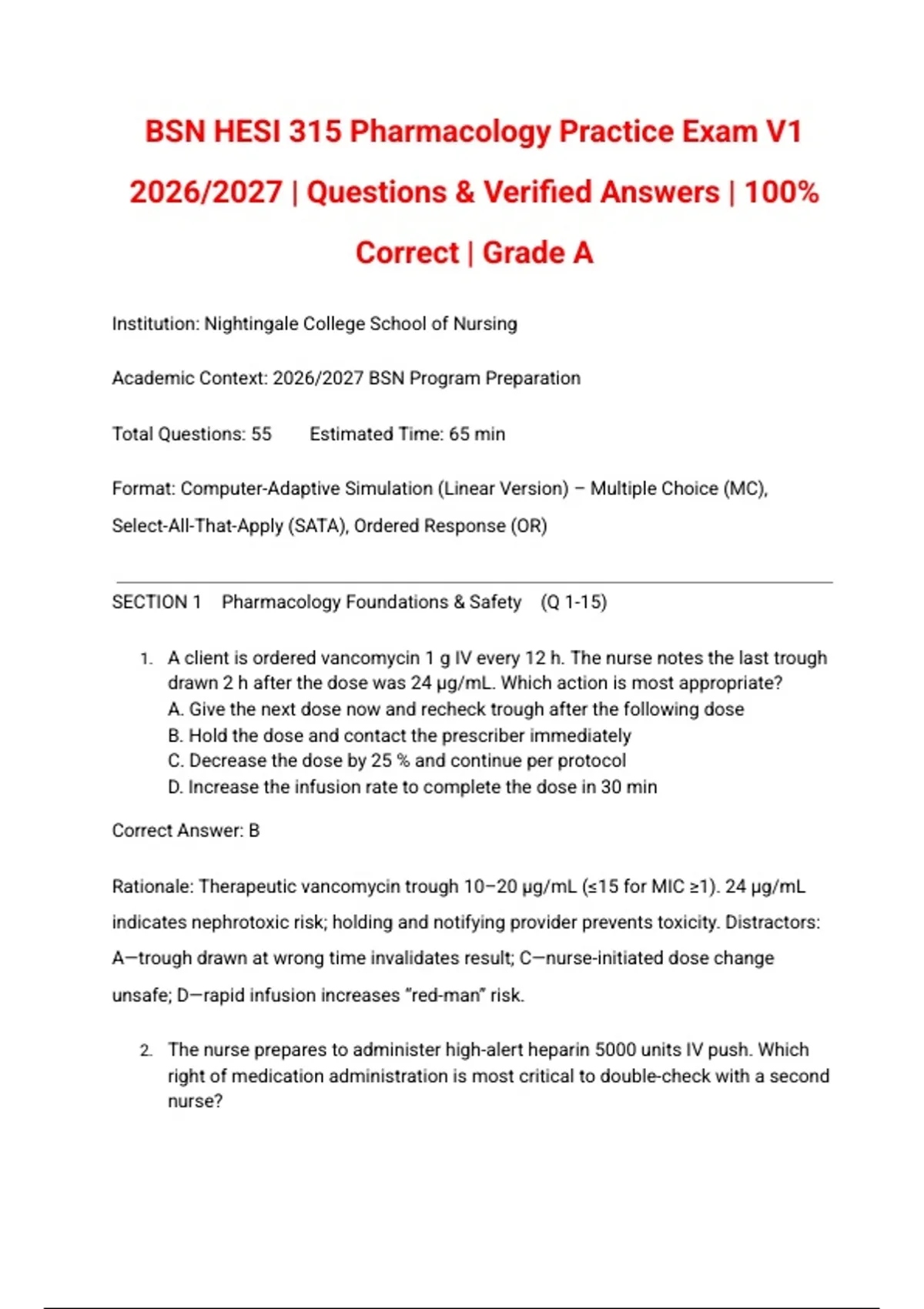 BSN HESI 315 Pharmacology Practice Exam V1 2026/2027 | Questions & Verified Answers | 100% Correct | Grade A
