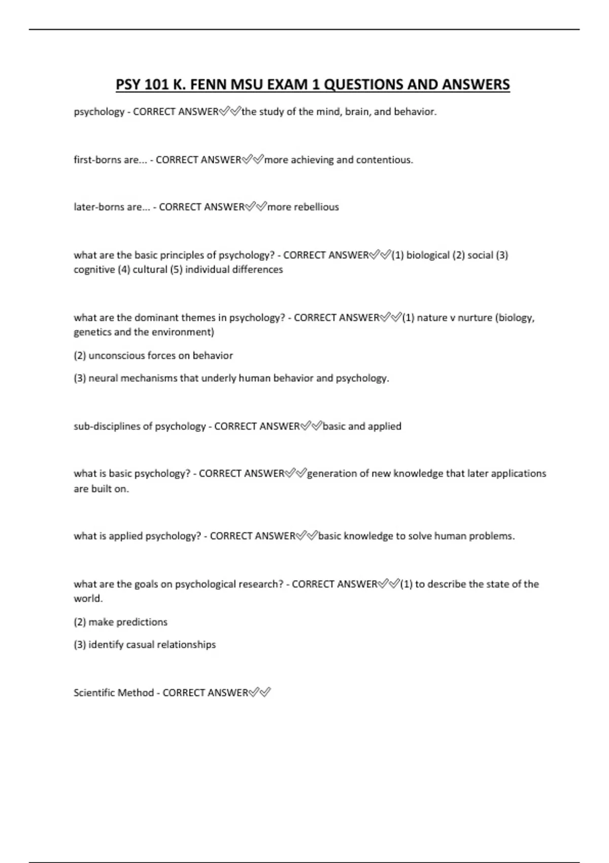 PSY 101 K. FENN MSU EXAM 1 QUESTIONS AND ANSWERS