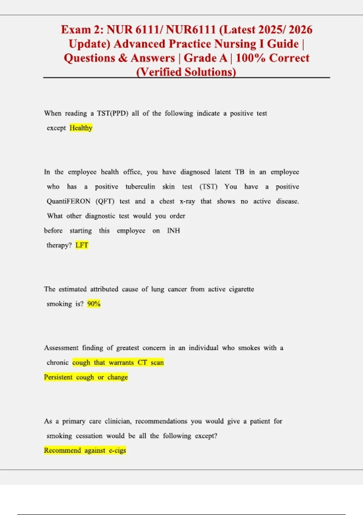 This is a comprehensive, 100% verified study guide for Exam 2 of NUR 6111 (Advanced Practice Nursing I). It contains high-yield questions and answers focused on respiratory health and infectious disease management in primary care. Key topics include the interpretation of Tuberculin Skin Tests (TST/PPD), diagnostic protocols for latent TB (QuantiFERON tests and LFTs), lung cancer screening guidelines for smokers, and the differential diagnosis of acute bronchitis versus pneumonia. This resource provides the essential clinical findings—such as persistent cough characteristics and chest radiograph indications—needed to confirm diagnoses and initiate evidence-based treatment plans.