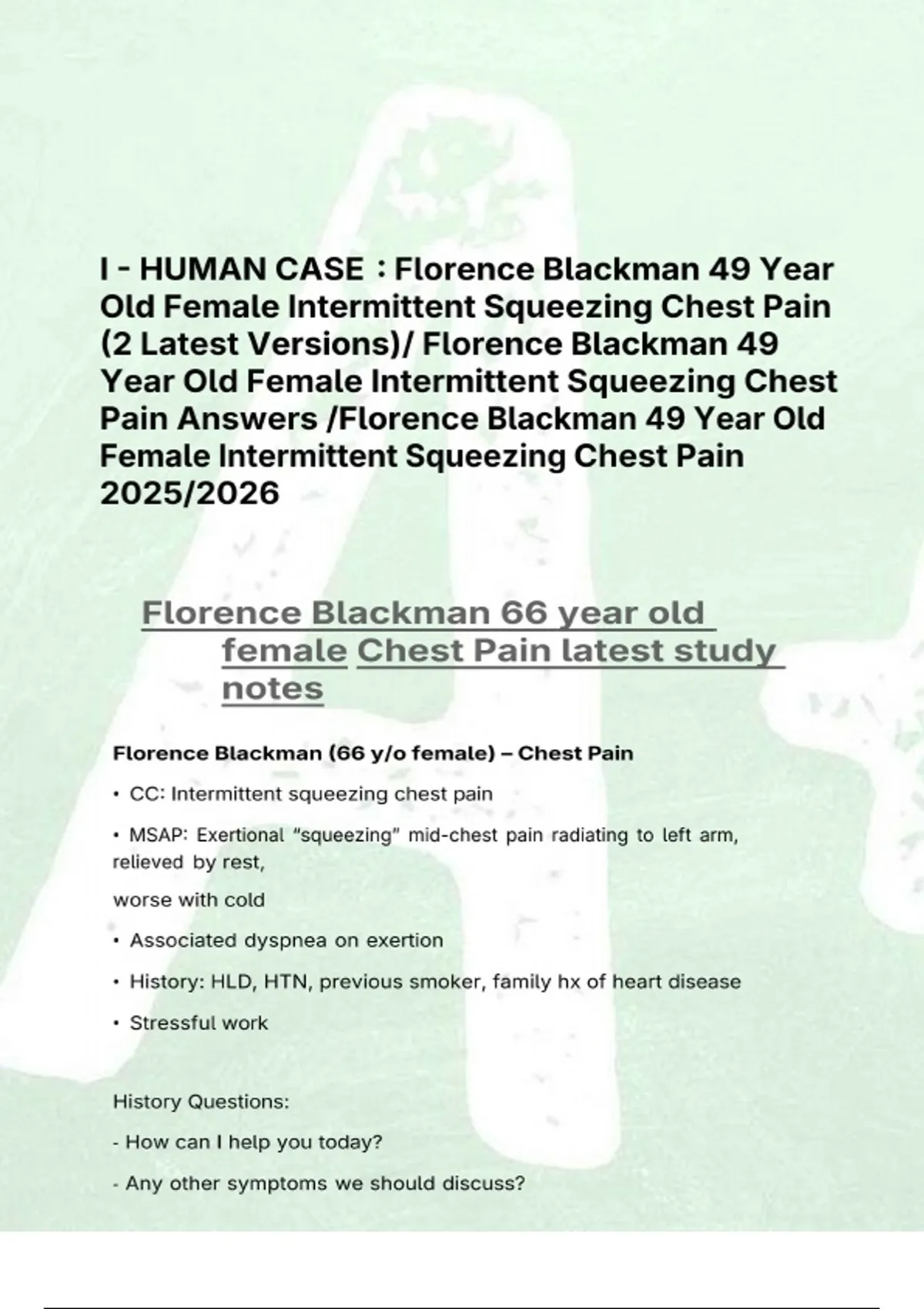 This document covers the I-Human clinical case of Florence Blackman, a 49-year-old female presenting with intermittent squeezing chest pain, including both of the latest case versions. It focuses on patient assessment, differential diagnosis, diagnostic testing, and clinical decision-making related to cardiovascular and chest pain evaluation. The material is suitable for case-based learning, exam preparation, and clinical reasoning practice.