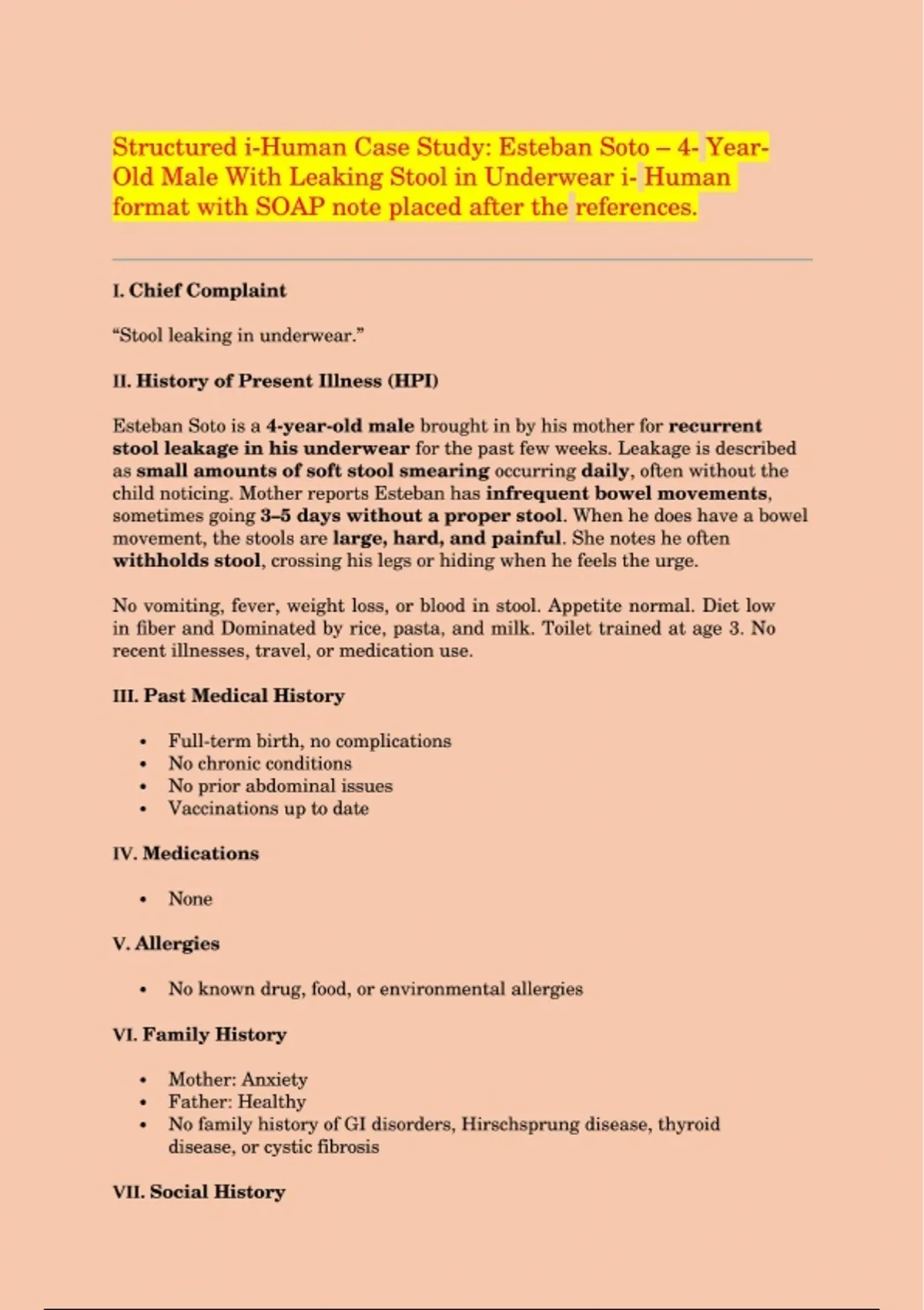 This document covers a fully structured I-Human case study for Esteban Soto, a 4-year-old male presenting with leaking stool in his underwear. It follows the I-Human clinical format, including history, physical exam, diagnostic reasoning, differential diagnosis, and management plan, with a SOAP note placed after the references as requested. The content supports pediatric assessment, clinical reasoning development, and coursework or exam preparation.