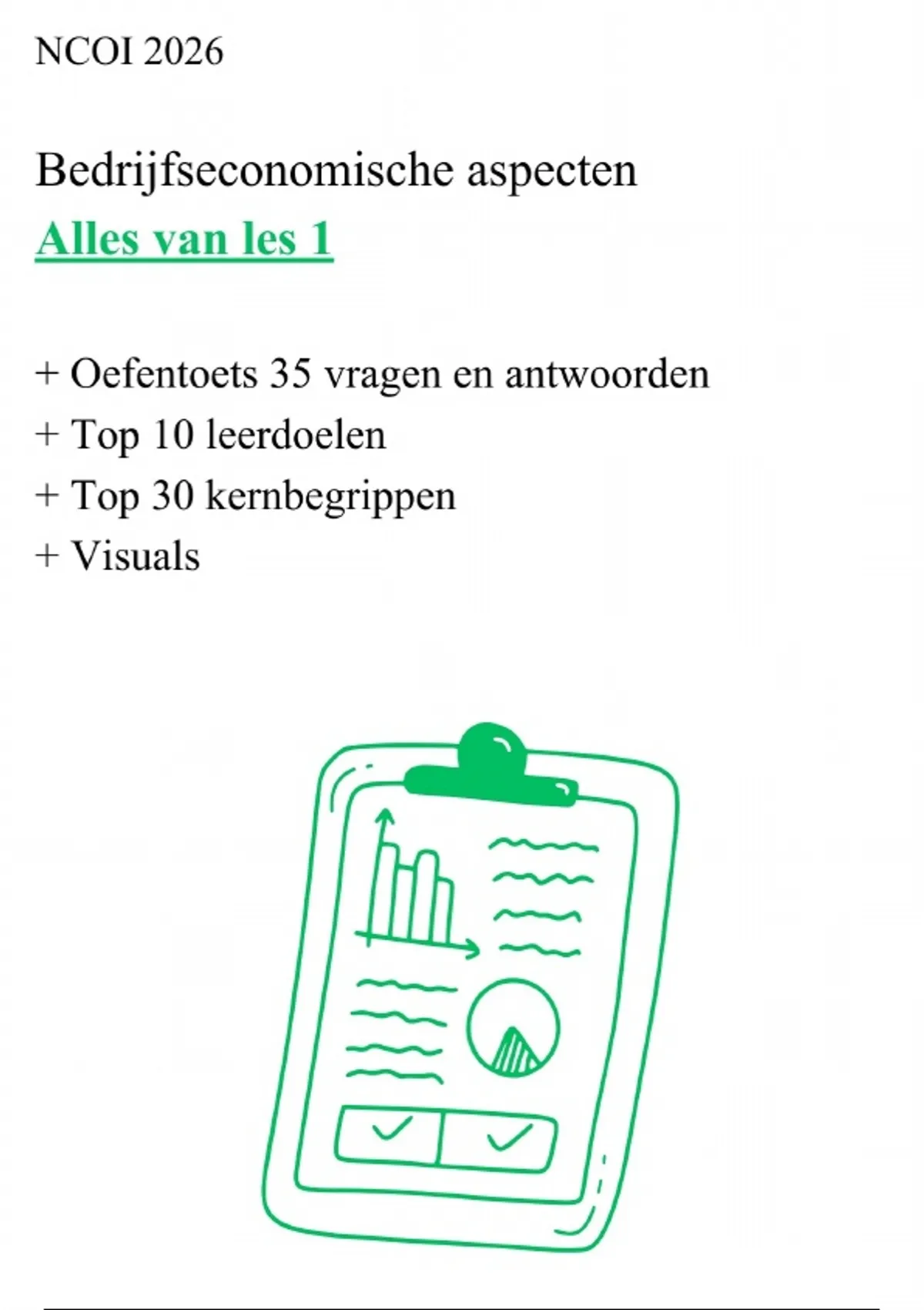 Dit is alles van les 1 van NCOI Bedrijfseconomische Aspecten van 2026. Het zijn mijn eigen aantekeningen maar dan alles netjes bij- en onder mekaar, goed leesbaar. Met de oefentoets en alle antwoorden, leerdoelen en belangrijkste kernbegripppen. Alles in 1.