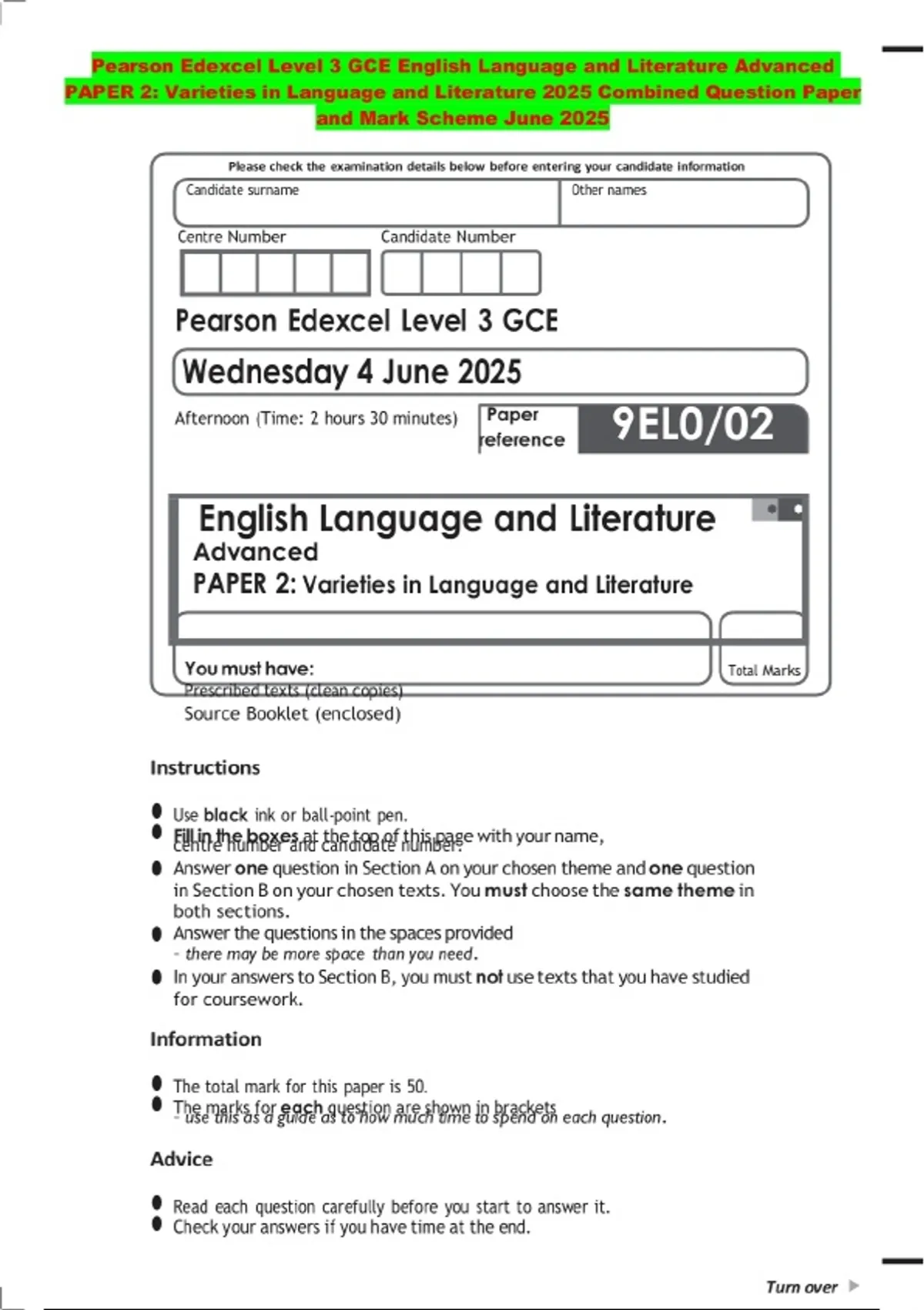 Pearson Edexcel Level 3 GCE English Language and Literature Advanced PAPER 2: Varieties in Language and Literature 2025 Combined Question Paper and Mark Scheme June 2025