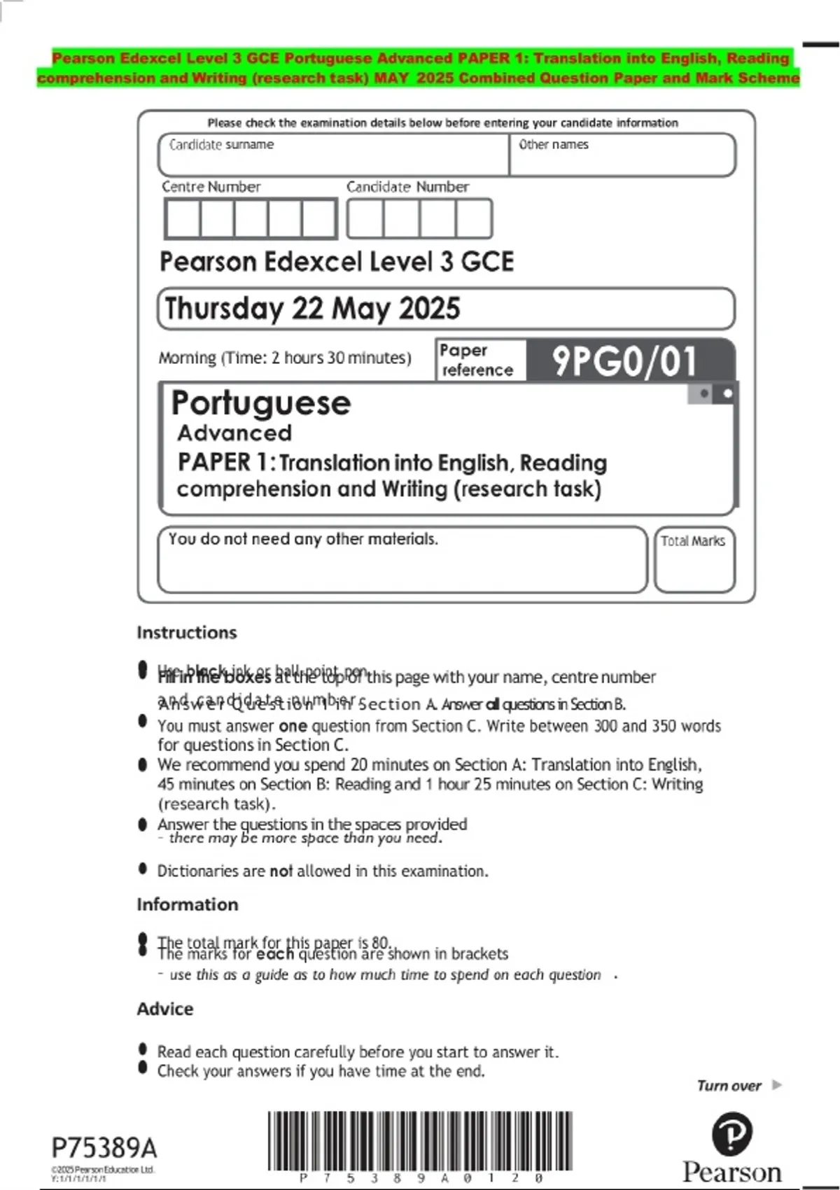Pearson Edexcel Level 3 GCE Portuguese Advanced PAPER 1: Translation into English, Reading comprehension and Writing (research task) MAY 2025 Combined Question Paper and Mark Scheme