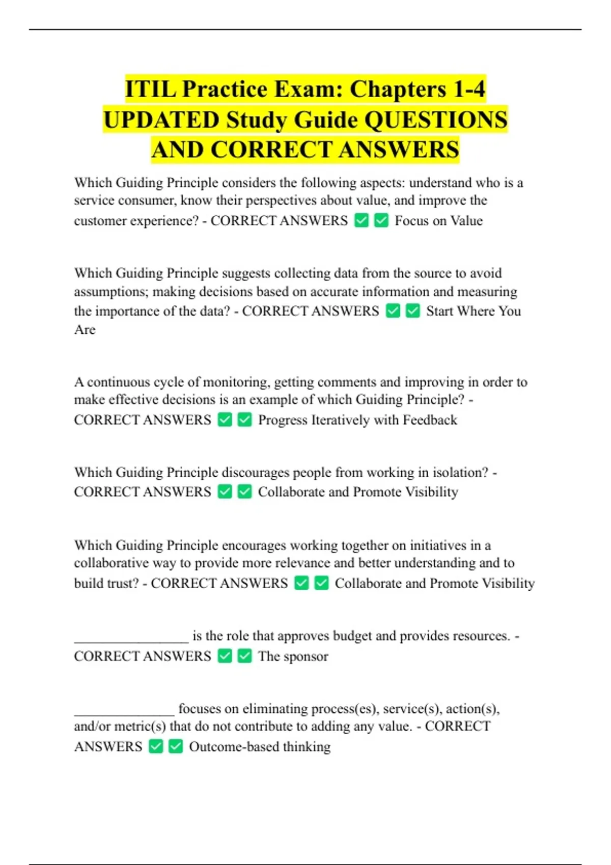 ITIL Practice Exam: Chapters 1-4 UPDATED Study Guide QUESTIONS AND CORRECT ANSWERS Which Guiding Principle considers the following aspects: understand who is a service consumer, know their perspectives about value, and improve the