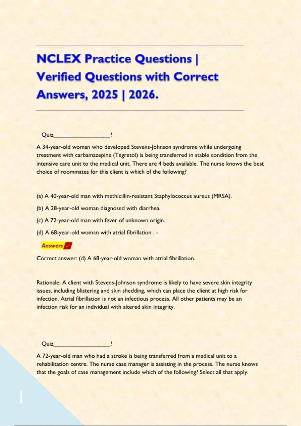 NCLEX Practice Questions | Verified Questions with Correct Answers, 2025 | 2026. Quiz_________________? A 34-year-old woman who developed Stevens-Johnson syndrome while undergoing treatment with carbamazepine (Tegretol) is being transferred in stable condition from the intensive care unit to the medical unit. There are 4 beds available. The nurse knows the best choice of roommates for this client is which of the following? (a) A 40-year-old man with methicillin-resistant Staphylococcus aureus (MRSA). (b) A 28-year-old woman diagnosed with diarrhea. (c) A 72-year-old man with fever of unknown origin. (d) A 68-year-old woman with atrial fibrillation . - Answers Correct answer: (d) A 68-year-old woman with atrial fibrillation. Rationale: A client with Stevens-Johnson syndrome is likely to have severe skin integrity issues, including blistering and skin shedding, which can place the client at high risk for infection. Atrial fibrillation is not an infectious process. All other patients may be an infection risk for an individual with altered skin integrity. Quiz_________________? A 72-year-old man who had a stroke is being transferred from a medical unit to a rehabilitation centre. The nurse case manager is assisting in the process. The nurse knows that the goals of case management include which of the following? Select all that apply. (a) Improving the coordination of care (b) Increasing referrals to local organizations (c) Reducing the fragmentation of care (d) Discharging clients quickly - Answers Correct answer: (a) Improving the coordination of care; and (c) Reducing the fragmentation of care Rationale: Some of the primary goals of case management are to improve the coordination of care and to reduce fragmentation of care. The other options are not goals of case management. Quiz_________________? A nursing team consists of an RN, an LPN/ LVN, and a nursing assistant. The nurse should assign which of the following patients to the LPN/LVN? (a) A 72-year-old patient with diabetes who requires a dressing change for a stasis ulcer. (b) A 42-year-old patient with cancer of the bone complaining of pain. (c) A 55-year-old patient with terminal cancer being transferred to hospice home care. (d) A 23-year-old patient with a fracture of the right leg who asks to use the urinal. - Answers Correct answer: (a) A 72-year-old patient with diabetes who requires a dressing change for a stasis ulcer. Rationale: LPN/LVNs assist with implementation of care; performs procedures; differentiates normal from abnormal; cares for stable patients with predictable conditions; has knowledge of asepsis and dressing changes; administers medications. Patient (a) is stable with an expected outcome. Patients (b) and (c) require assessment and nursing judgement; and Patient (d) involves a standard unchanging procedure that can be assigned to the nursing assistant. Quiz_________________? A pregnant woman at 15 weeks' gestation is scheduled for an amniocentesis. As the client is being prepped for the procedure, it becomes clear to the nurse that the client doesn't fully understand the risks and benefits associated with the procedure. Which of the following describe the nurse's role in obtaining informed consent? Select all that apply. (a) Explain the risks and benefits associated with the procedure. (b) Describe alternatives to the procedure. (c) Witness the client's signature on the consent form. (d) Advocate for the client by ensuring she is making an informed decision. - Answers Correct answer: (c) Witness the client's signature on the consent form; and (d) Advocate for the client by ensuring she is making an informed decision. Rationale: Some of the nurse's roles in the informed consent process are to witness the signature on the consent form, and to advocate for the client by ensuring she has been provided the necessary information to make an informed decision. It is the physician's duty to provide information to the client-related risks and benefits, and to provide alternatives.