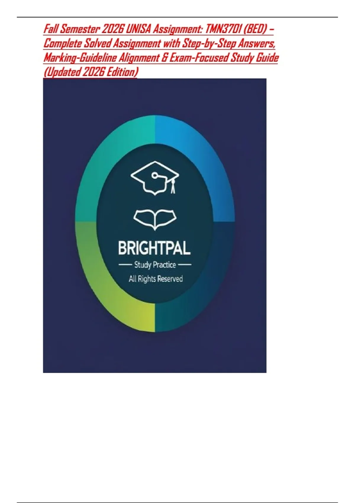 This Fall Semester 2026 UNISA TMN3701 (BED) assignment is a fully solved, marking-guideline-aligned resource updated for 2026. It covers core topics including teaching methodologies, learning theories, classroom management strategies, curriculum integration, lesson planning, and assessment techniques, all presented through clear step-by-step explanations and structured answers. Designed to support accurate assignment submission, portfolio development, and exam preparation, this guide helps UNISA education students master practical teaching skills, deepen theoretical understanding, and achieve higher marks.