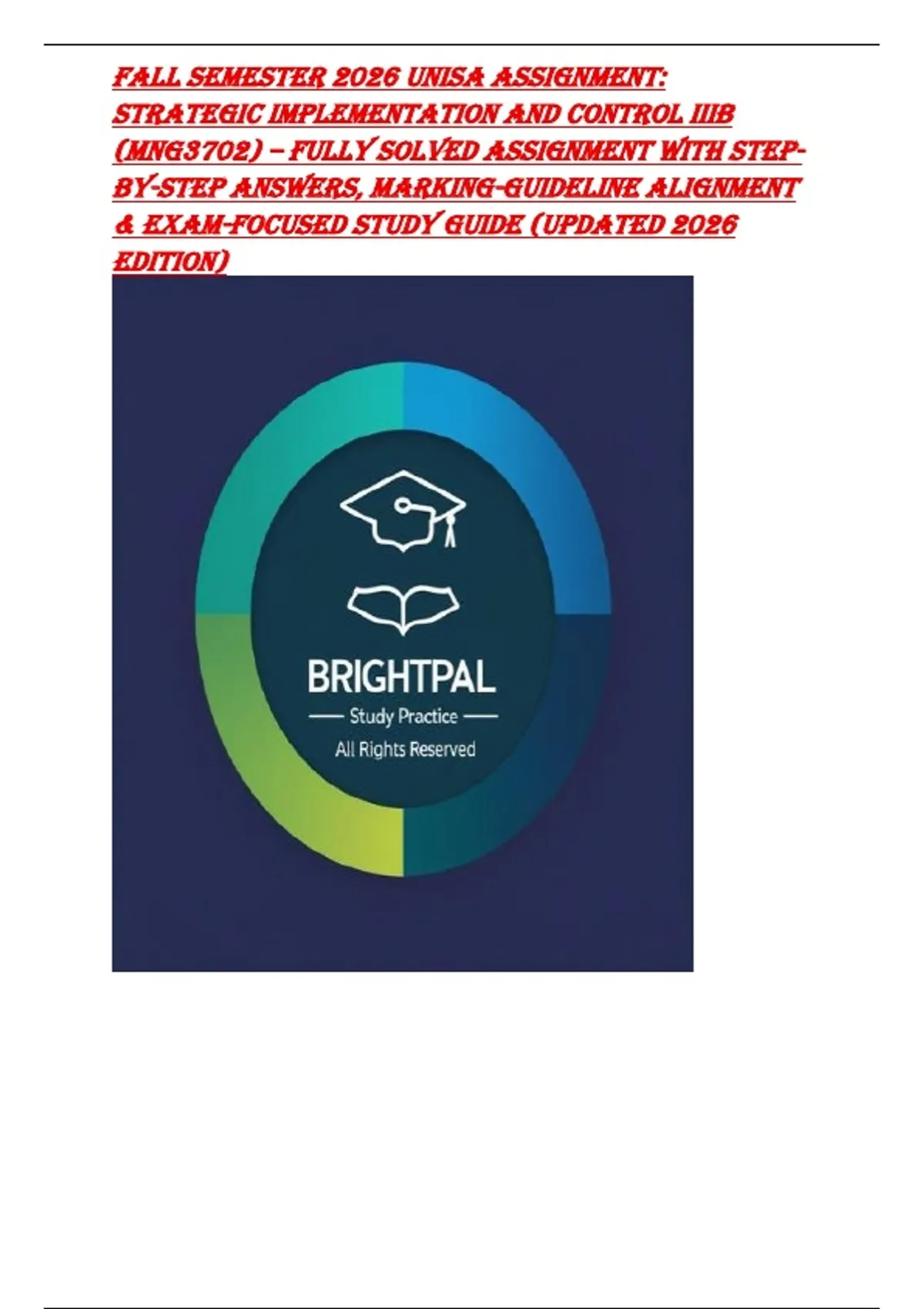 This Fall Semester 2026 UNISA MNG3702 Strategic Implementation and Control IIIB assignment is a fully solved, marking-guideline-aligned resource updated for 2026. It covers essential topics including strategy execution, control systems, performance monitoring, risk assessment, resource management, and strategic decision-making, all presented with clear step-by-step explanations and structured answers. Designed for accurate assignment submission, portfolio development, and exam preparation, this guide helps UNISA management students understand and apply strategic implementation concepts effectively, develop practical skills, and achieve higher marks.
