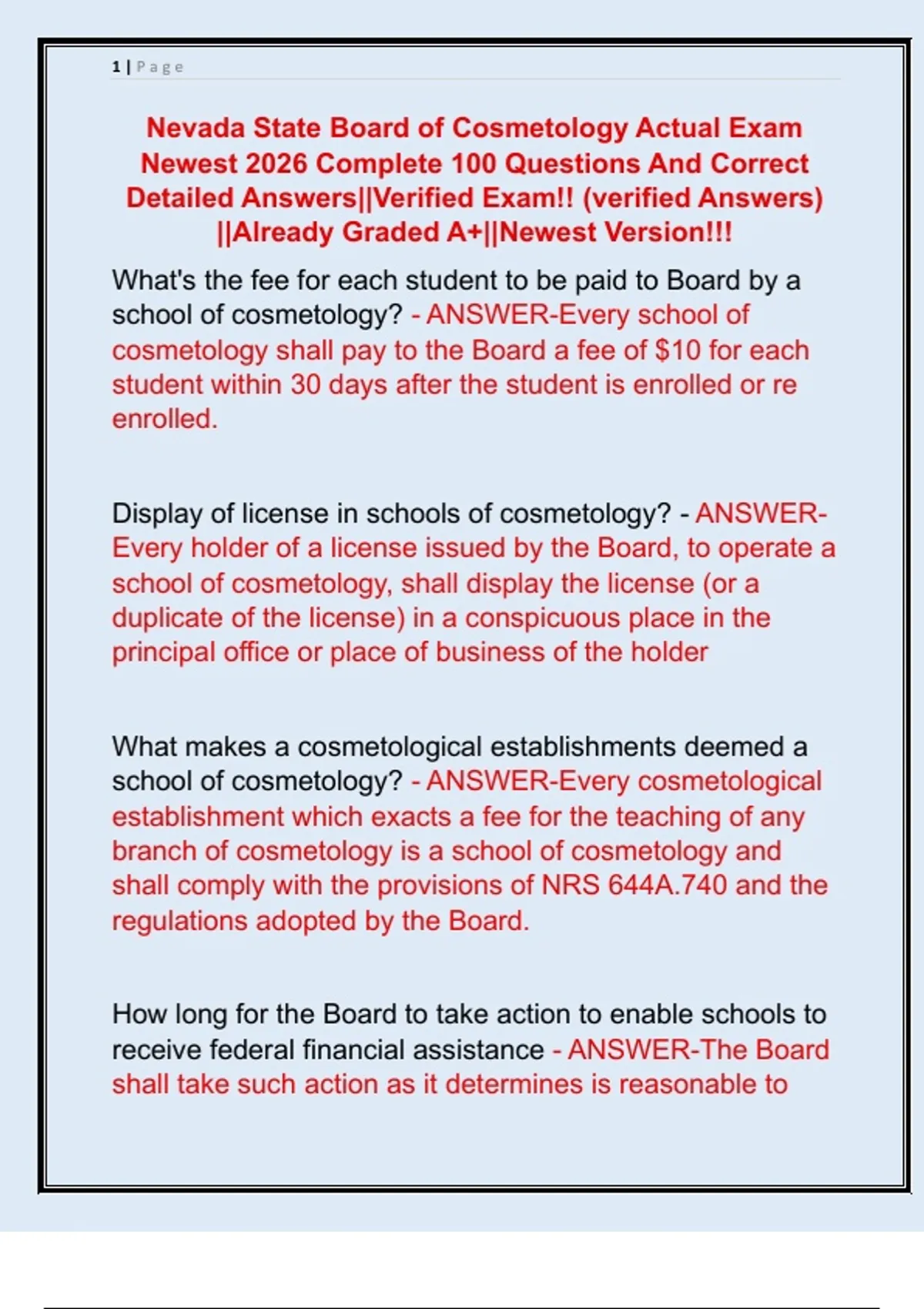 Nevada State Board of Cosmetology Actual Exam Newest 2026 Complete 100 Questions And Correct Detailed Answers||Verified Exam!! (verified Answers) ||Already Graded A+||Newest Version!!!