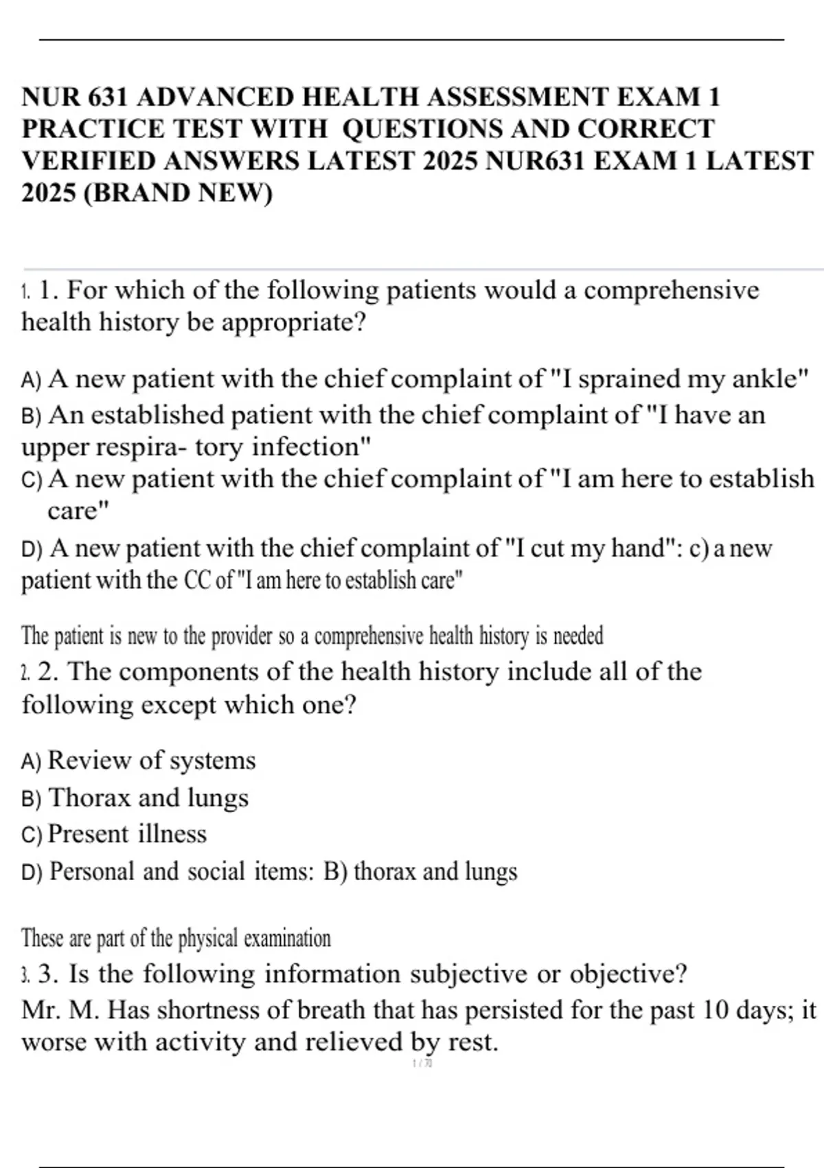 NUR 631 ADVANCED HEALTH ASSESSMENT EXAM 1 PRACTICE TEST WITH QUESTIONS AND CORRECT VERIFIED ANSWERS LATEST 2025 NUR631 EXAM 1 LATEST 2025 (BRAND NEW)