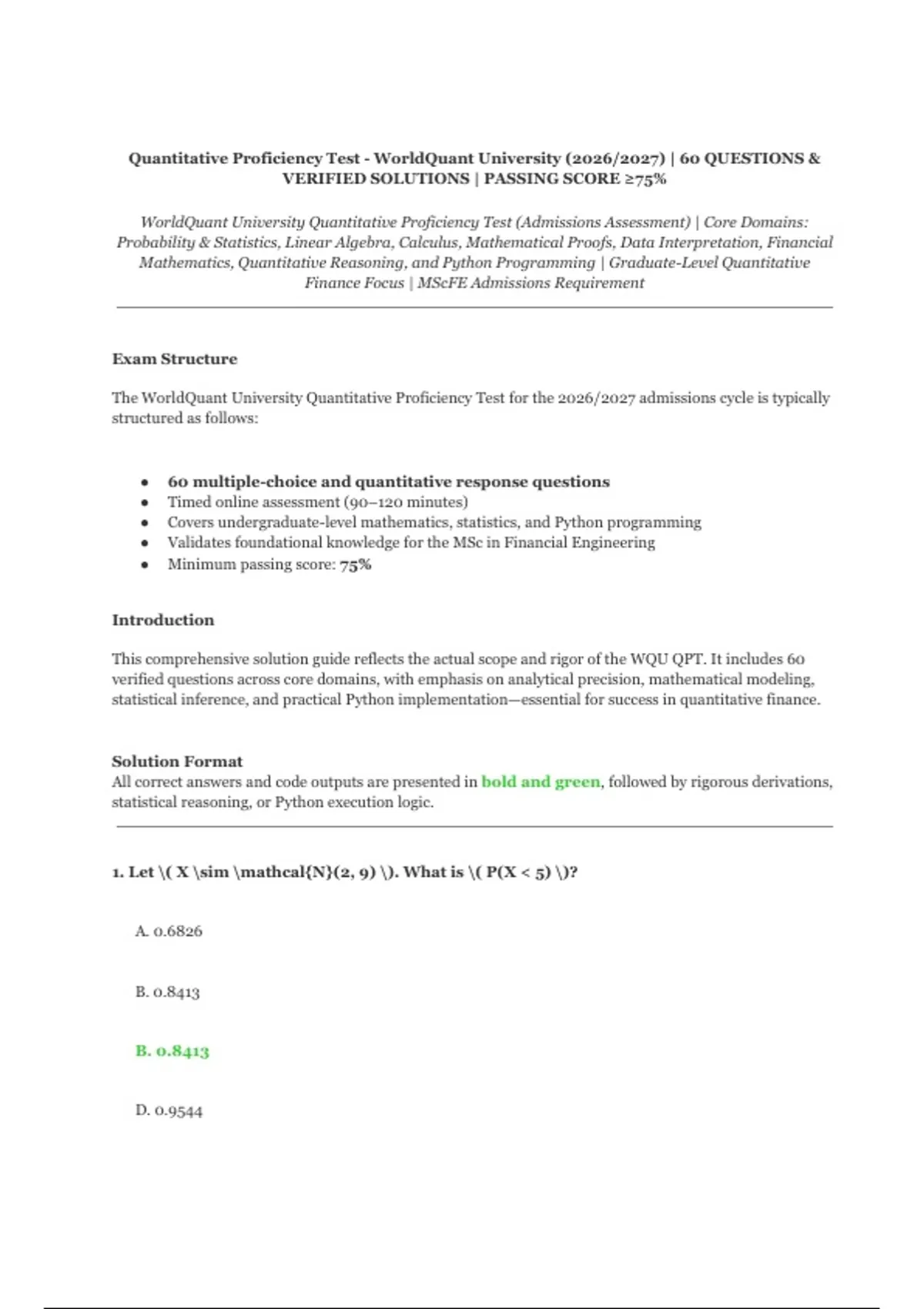 Quantitative Proficiency Test - WorldQuant University 2026/2027 | 60 Questions & Verified Solutions | Passing Score ≥75%