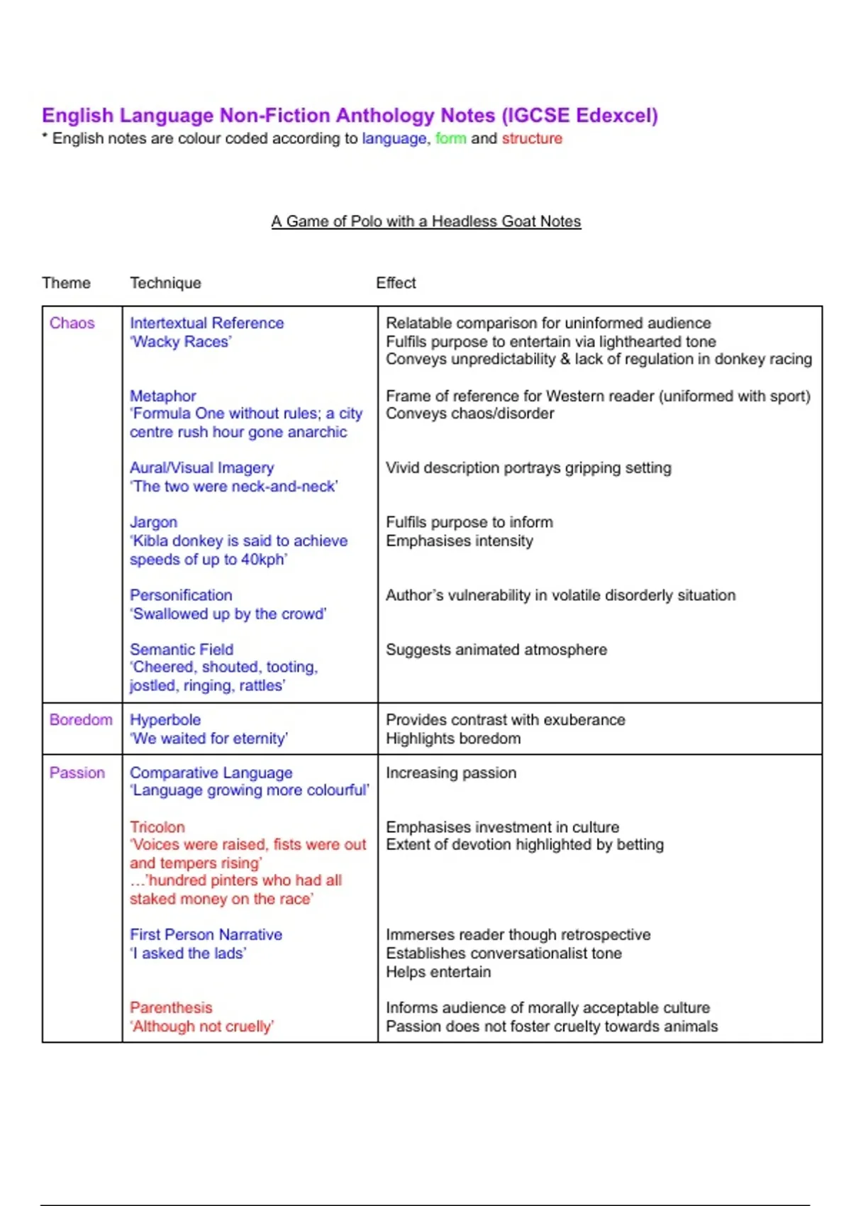 * English notes are colour coded according to language, form and structure