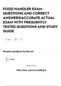 FOOD HANDLER EXAM QUESTIONS AND CORRECT ANSWERS|ACCURATE ACTUAL EXAM WITH FREQUENTLY TESTED QUESTIONS AND STUDY GUIDE