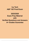 Ace your A&P 102 Final Exam at Ivy Tech with this comprehensive 2025/2026 study guide, expertly crafted to help you master Anatomy and Physiology II concepts. This verified exam prep pack includes accurate questions, detailed answers, and clear explanations of topics such as the cardiovascular, respiratory, digestive, and endocrine systems. Perfect for both lecture and lab review, this A&P 102 Final Exam Study Pack helps students strengthen their understanding and boost their confidence for top ...