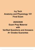 Prepare to ace your Ivy Tech Anatomy and Physiology 101 Final Exam (2025/2026 Edition) with this expert-verified study guide, featuring accurate exam-style questions, detailed answers, and concept explanations. Covering all major topics—cells, tissues, skeletal and muscular systems, cardiovascular function, and organ physiology—this Ivy Tech A&P 101 Study Pack is perfect for quizzes, lab reviews, and final exam prep. Designed to help nursing and health science students master anatomy fundame...