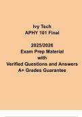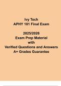 Prepare to excel in your Ivy Tech APHY 101 – Anatomy and Physiology I Final Exam (2025/2026 Edition) with this expert-verified study guide, featuring accurate exam-style questions, detailed answers, and clear explanations. This resource covers foundational anatomy and physiology topics including cells, tissues, integumentary, skeletal, muscular, and nervous systems. Ideal for nursing, biology, and pre-health students, this Ivy Tech APHY 101 Final Exam Study Pack provides the essential tools an...