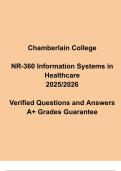 Get ready to excel in NR-360 Information Systems in Healthcare with this comprehensive 2025/2026 exam prep and study guide. It includes verified questions, accurate answers, and detailed concept explanations covering healthcare informatics, data security, EHR systems, and technology integration in nursing practice. Designed specifically for Chamberlain College of Nursing students, this guide strengthens your understanding of nursing technology and digital health systems—ensuring A+ performance...