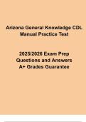 Get ready to pass your Arizona General Knowledge CDL Exam with this expert-verified 2025/2026 Practice Test and Study Guide. Designed to match the official Arizona CDL manual, this resource includes accurate, up-to-date questions and detailed answers covering vehicle inspection, road safety, driving laws, and hazardous materials basics. Whether you’re preparing for your first attempt or brushing up for a retake, this comprehensive guide helps you build confidence and ensures success on your Ar...