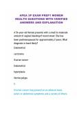 Enerd En esta página, encontrarás todos los documentos, paquetes y tarjetas que ofrece el vendedor eNerd. 865 Documentos 0 Tarjetas de estudio 16 Paquetes Community 5 Seguidores 3 Siguiendo 121 Comentarios recibidos 84 21 7 3 6 1 mes hace • sunshine3100 Gerontology HESI test Questions and complete answers 2 meses hace • PressUP HESI A2 Anatomy AND Physiology Qoestions WITH Correct Answers A+ Score Expert Verified Latest 2 meses hace • PressUP Hesi A2 Basic Math Skills. 2 meses hace • PressUP HESI A2 Biology EXAM 2024 / 2025 QUESTIONS AND ANSWERS 2 meses hace • PressUP Health Assessment - HESI Prep 2 Questions & answers with Rationales,Verified Solutions + Mostrar mas comentarios 882 artículos Todo Documentos Tarjetas de estudio Paquetes Lo más vendido El más nuevo Puntuación ASCP Technologist in Molecular Biology Exam Prep | 2026/2027 Complete Questions & Solutions Graded A+ (0) $21.99 0x vendido Access the ASCP Technologist in Molecular Biology Exam Prep with complete exam questions, verified answers, and detailed solutions graded A+, updated for 2026/2027. Covers key molecular biology concepts including DNA/RNA techniques, PCR, sequencing, gene expression, lab safety, instrumentation, and quality control. Ideal for laboratory technologists, students, and exam candidates, this resource reinforces practical knowledge, strengthens problem-solving, and ensures top performance on board exam... i x Examen • 74 páginas • por eNerd • subido 2026 Vista rápida i x TECHNOLOGIST IN MOLECULAR BIOLOGY • TECHNOLOGIST IN MOLECULAR BIOLOGY Artificial Intelligence Practice Quiz | 2026/2027 Questions & Correct Answers (0) $21.99 0x vendido Access the Artificial Intelligence Practice Quiz with complete questions and correct answers, updated for 2026/2027. Covers key AI concepts including machine learning, neural networks, natural language processing, AI algorithms, and practical applications. Ideal for students, professionals, and exam preparation, this resource reinforces knowledge, strengthens problem-solving skills, and improves performance in AI assessments. i x Examen • 4 páginas • por eNerd • subido 2026 Vista rápida i x Artificial Intelligence • Artificial Intelligence APEA Pregnancy Exam Practice Qbank | 2026/2027 Questions & Verified Answers (0) $21.99 0x vendido Access the APEA Pregnancy Practice Qbank with complete questions and verified answers, updated for 2026/2027. Covers core women’s health and maternity nursing topics including prenatal care, labor and delivery, postpartum care, maternal complications, and patient education. Ideal for nursing students, advanced practice nurses, and exam preparation, this resource reinforces clinical knowledge, improves critical thinking, and strengthens exam performance. i x Examen • 21 páginas • por eNerd • subido 2026 Vista rápida i x APEA Pregnancy • APEA Pregnancy APEA 3P Exam Prep 1: Women’s Health | 2026/2027 Questions & Verified Answer (0) $21.99 0x vendido Access APEA 3P Exam Prep 1: Women’s Health with complete questions and verified answers, updated for 2026/2027. Covers core women’s health topics including reproductive system, prenatal care, labor and delivery, postpartum care, gynecological health, family planning, and patient education. Ideal for nursing students, advanced practice nurses, and exam preparation, this resource reinforces clinical knowledge, improves problem-solving skills, and boosts exam performance. i x Examen • 48 páginas • por eNerd • subido 2026 Vista rápida i x WOMEN HEALTH • WOMEN HEALTH AORN PERIOP 101 Final Exam | 2026/2027 Questions & Correct Answers with Rationales (0) $21.99 0x vendido Access the AORN PERIOP 101 Final Exam with complete questions and correct answers, updated for 2026/2027. Covers perioperative nursing principles including sterile technique, surgical instrumentation, patient safety, preoperative and postoperative care, infection control, and operating room protocols. Ideal for perioperative nursing students, surgical technologists, and exam preparation, this resource reinforces clinical knowledge, improves decision-making, and boosts exam performance. i x Examen • 85 páginas • por eNerd • subido 2026 Vista rápida i x AORN PERIOP 101 • AORN PERIOP 101 Test Bank for Torres: Medical-Surgical Nursing | 2026/2027 Complete Chapter Questions & Answers with Rationales (0) $21.99 0x vendido Download the Test Bank for Torres: Medical-Surgical Nursing, updated for 2026/2027. This resource includes chapter-by-chapter questions, verified answers, and detailed rationales, covering core medical-surgical nursing concepts, patient care, disease management, pharmacology, and clinical decision-making. Perfect for nursing students, instructors, and NCLEX preparation, this test bank reinforces understanding, strengthens critical thinking, and supports top exam performance. i x Examen • 170 páginas • por eNerd • subido 2026 Vista rápida i x PATIENT CARE IN IMAGING TECHNOLOGY • PATIENT CARE IN IMAGING TECHNOLOGY Nursing Interventions and Clinical Skills 7th Edition Test Bank by Marianne Scheetz Ackley and Mary Beth Flynn Berman | Verified Questions and Answers (0) $21.99 0x vendido Comprehensive test bank for Nursing Interventions and Clinical Skills 7th Edition by Marianne Scheetz Ackley and Mary Beth Flynn Berman. Includes verified questions and answers covering nursing procedures, patient care, clinical interventions, critical thinking, and exam-focused content for nursing students. i x Examen • 625 páginas • por eNerd • subido 2026 Vista rápida i x Nursing interventions and clinical skills • Nursing interventions and clinical skills Abnormal Psychology 18th Edition Test Bank by Jill M. Hooley | Verified Questions and Answers (0) $21.99 0x vendido Comprehensive test bank for Abnormal Psychology 18th Edition by Jill M. Hooley. Includes verified questions and answers covering psychological disorders, diagnostic criteria, treatmen