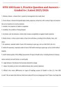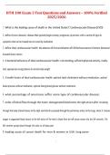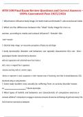 This document contains updated HTH 100 Exam #1 practice questions with 100% correct answers for the 2025/2026 academic year. It covers essential introductory health topics including wellness and health promotion, determinants of health, stress and coping mechanisms, physical fitness, nutrition fundamentals, and disease prevention strategies. The corrected answers provide clear explanations aligned with course objectives, making this guide ideal for accurate and efficient exam preparation.