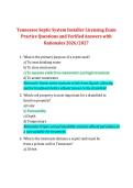 This document provides a comprehensive set of practice exam questions for the Tennessee Septic System Installer Licensing Exam, including correct answers and clear rationales. It covers key topics such as septic system components, soil evaluation, permitting requirements, setbacks, installation standards, and common system failures, aligned with current Tennessee regulations for the 2026/2027 exam cycle. The material is suitable for exam preparation and review for both first-time test takers and...