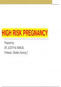 This document provides detailed lecture-based summaries on high-risk pregnancies, covering conditions such as hypertensive disorders, gestational diabetes, anemia, heart disease, thyroid dysfunction, and infectious diseases during pregnancy. It includes diagnostic features, clinical presentations, maternal-fetal complications, and evidence-based management protocols. This material is ideal for medical students and OB/GYN trainees preparing for exams or clinical rotations.