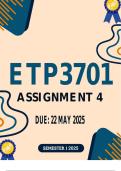 This document contains the complete Assignment 4 submission for ETP3701, centered on the entrepreneurial journey of Given Ngwamba and his sustainable venture, Nzilo Charcoal. It includes four structured essay responses analyzing innovation types, sustainability impact, the 4Ps Creativity Model, community benefits, managerial success factors, and broader entrepreneurial challenges in South Africa. The content is ideal for students studying entrepreneurship, innovation strategy, and sustainable bu...